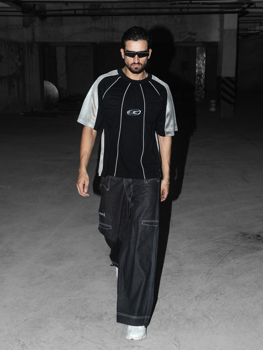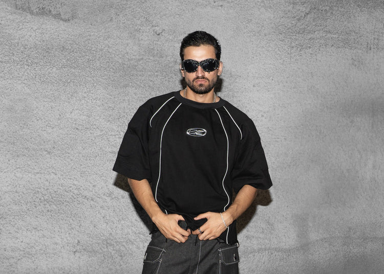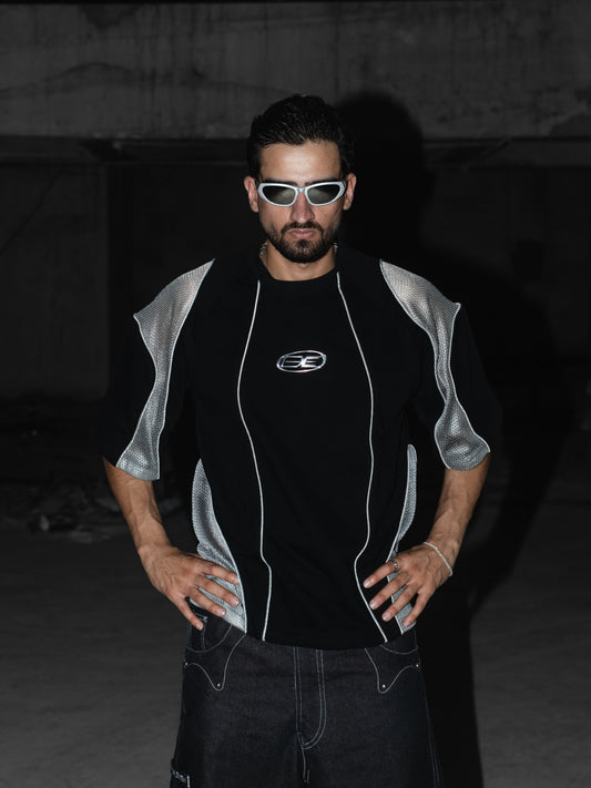 Each piece carries its own identity—black T-shirts detailed with silver piping, padded structure, patchwork, or hand-finished raw edges. The padding, seams, and structural details are inspired by body movement and muscle anatomy, designed to flex, shift, and respond naturally. Some precise, some unruly—each built to stand apart.