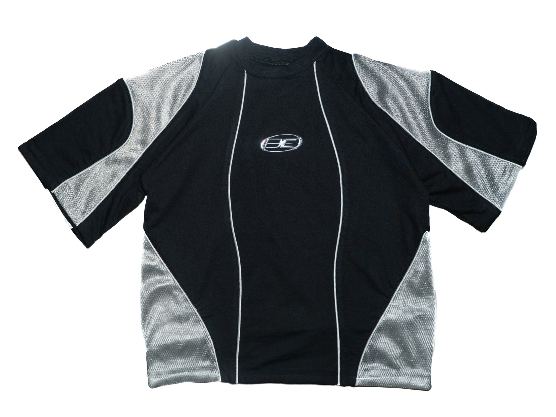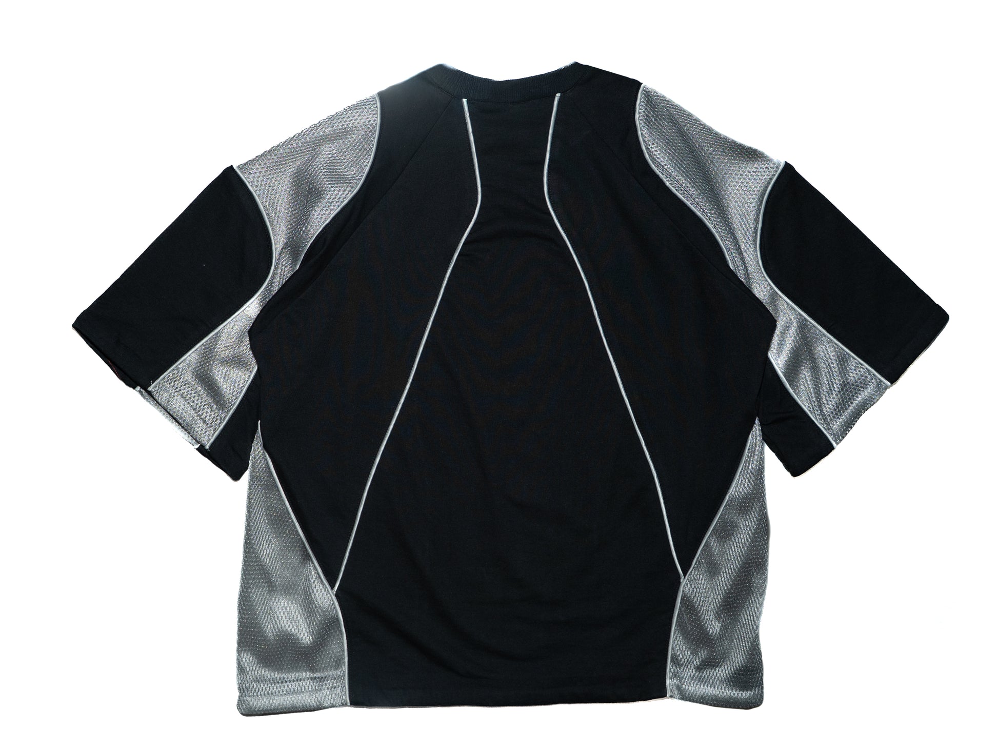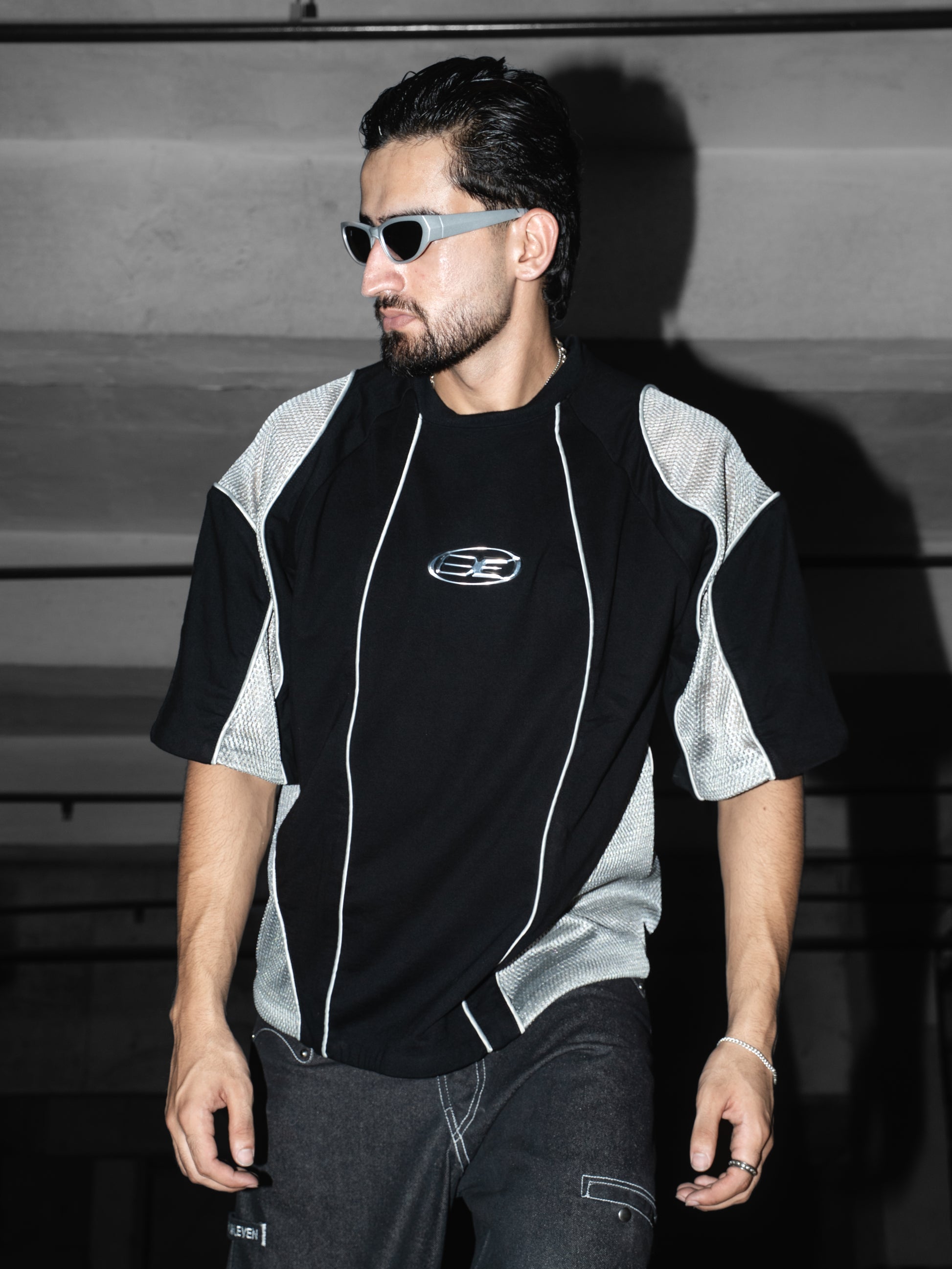 Made from 100% cotton terry and a double-knitted polyester blend, this oversized T-shirt is defined by bold patchwork construction. Silver satin piping runs through the seams, adding a sharp, sporty edge to the design. The oversized silhouette enhances versatility, making it a statement layer for both everyday wear and styled looks.