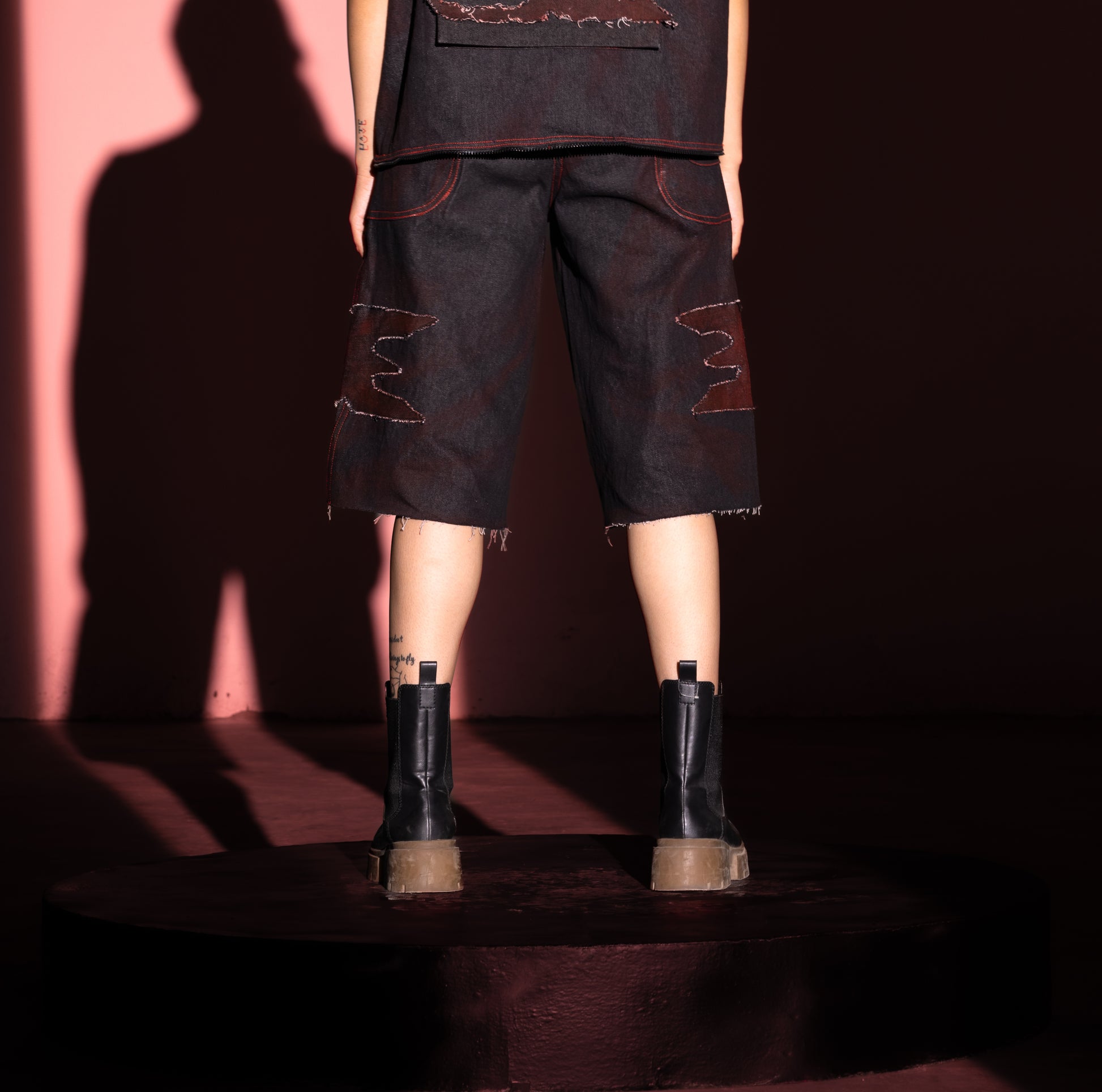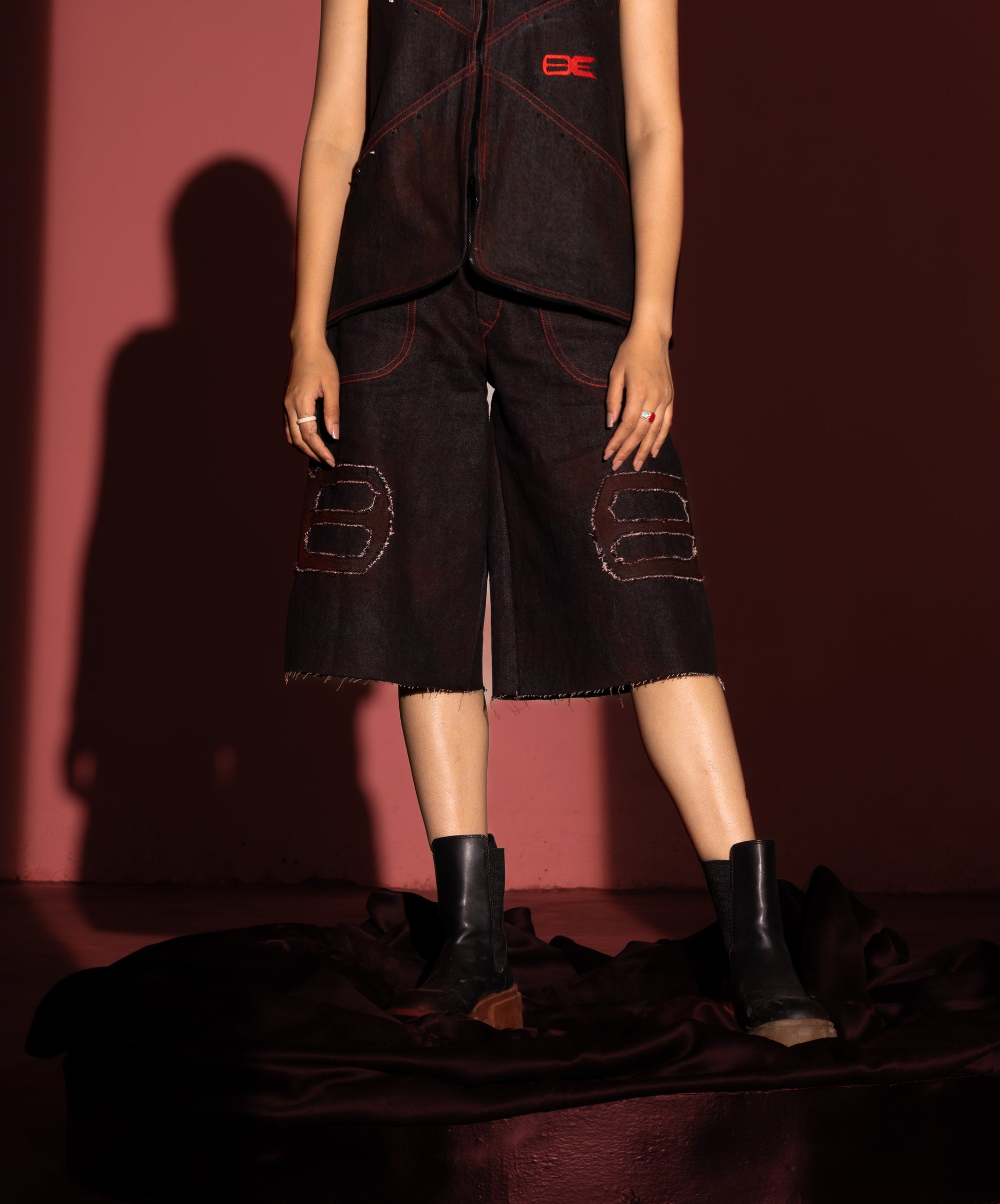 Confeccionados en 100 % denim negro crudo, estos pantalones cortos tienen un tratamiento interno con tintes rojos para un acabado atrevido y vanguardista. Las costuras rojas en contraste le dan un toque vibrante, mientras que sus seis bolsillos sin costuras ofrecen un uso diario. Con el nuevo parche con el logo de Breakkin Even, son un básico imprescindible para el verano.
