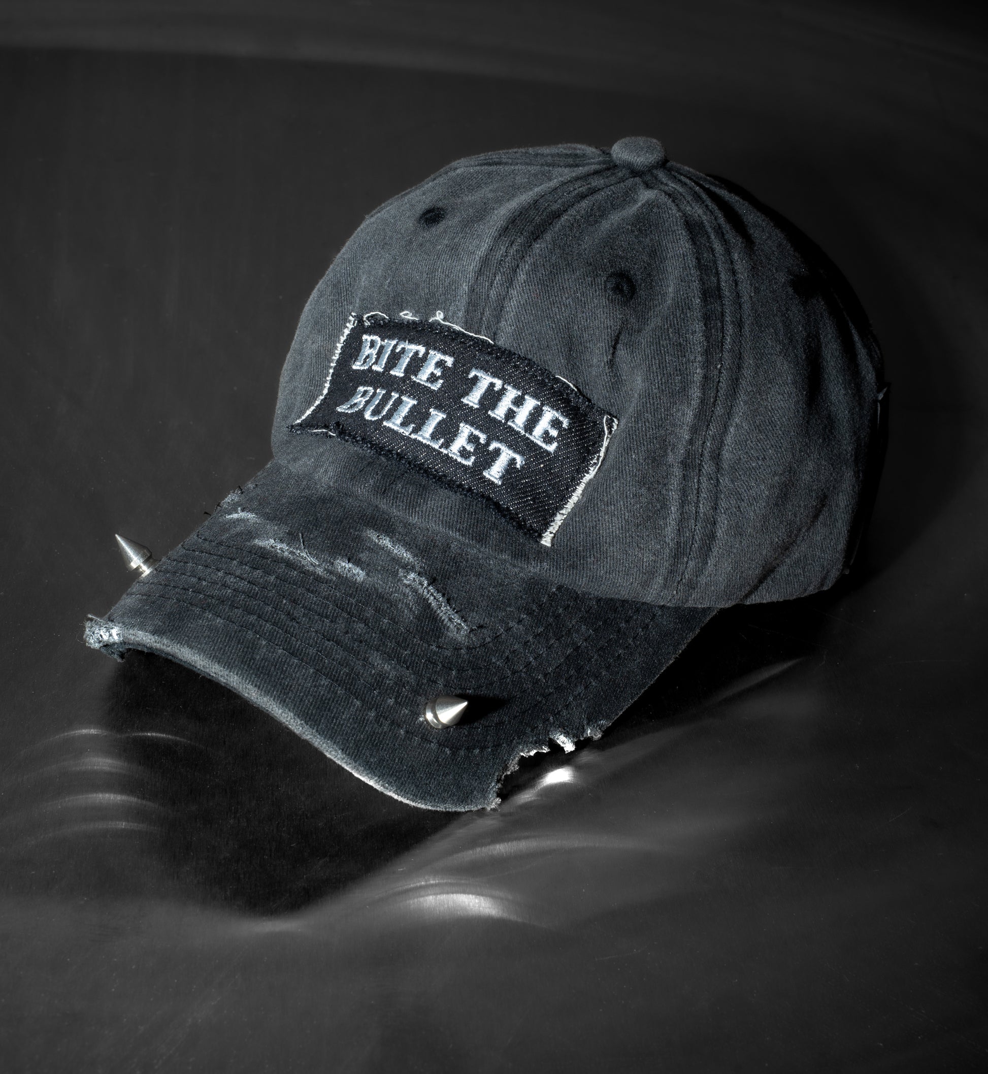 Grey denim with “BITE THE BULLET” embroidered patch on the front, hand-distressed bite mark detailing on the brim, “BREAKKIN EVEN” embroidered patch and upcycled reconstructed leather patch on the back, metallic studs on the brim, and adjustable strap.