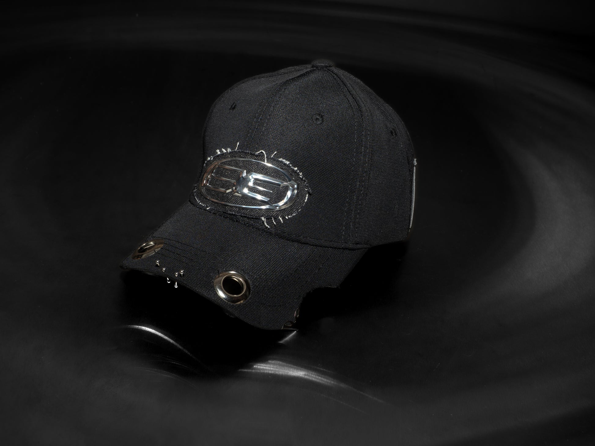 Metallic rivets and piercings on the brim, metallic BE logo on the front panel, upcycled and reconstructed leather patch at the back, with hand-cutout detailing on the brim.
