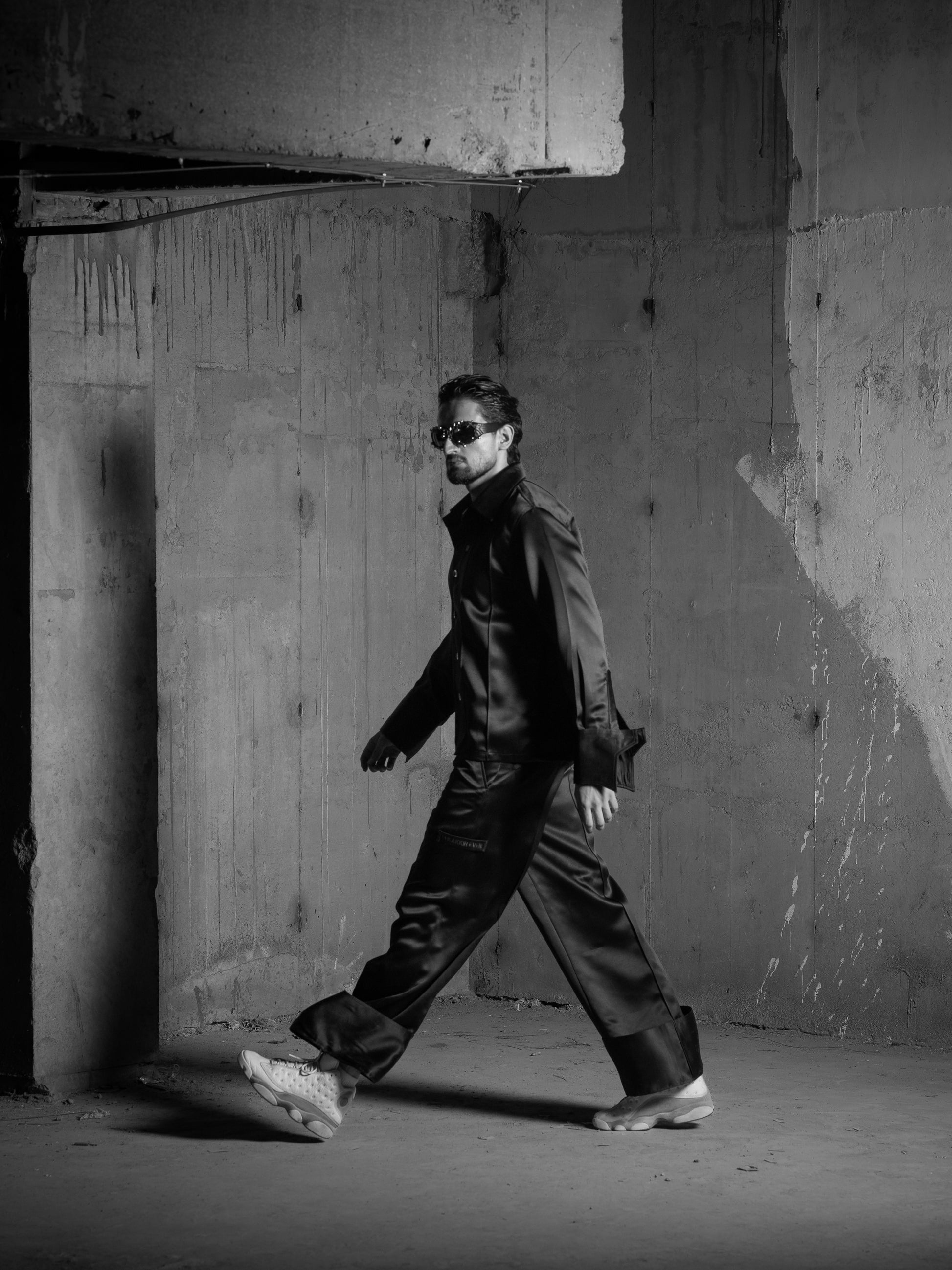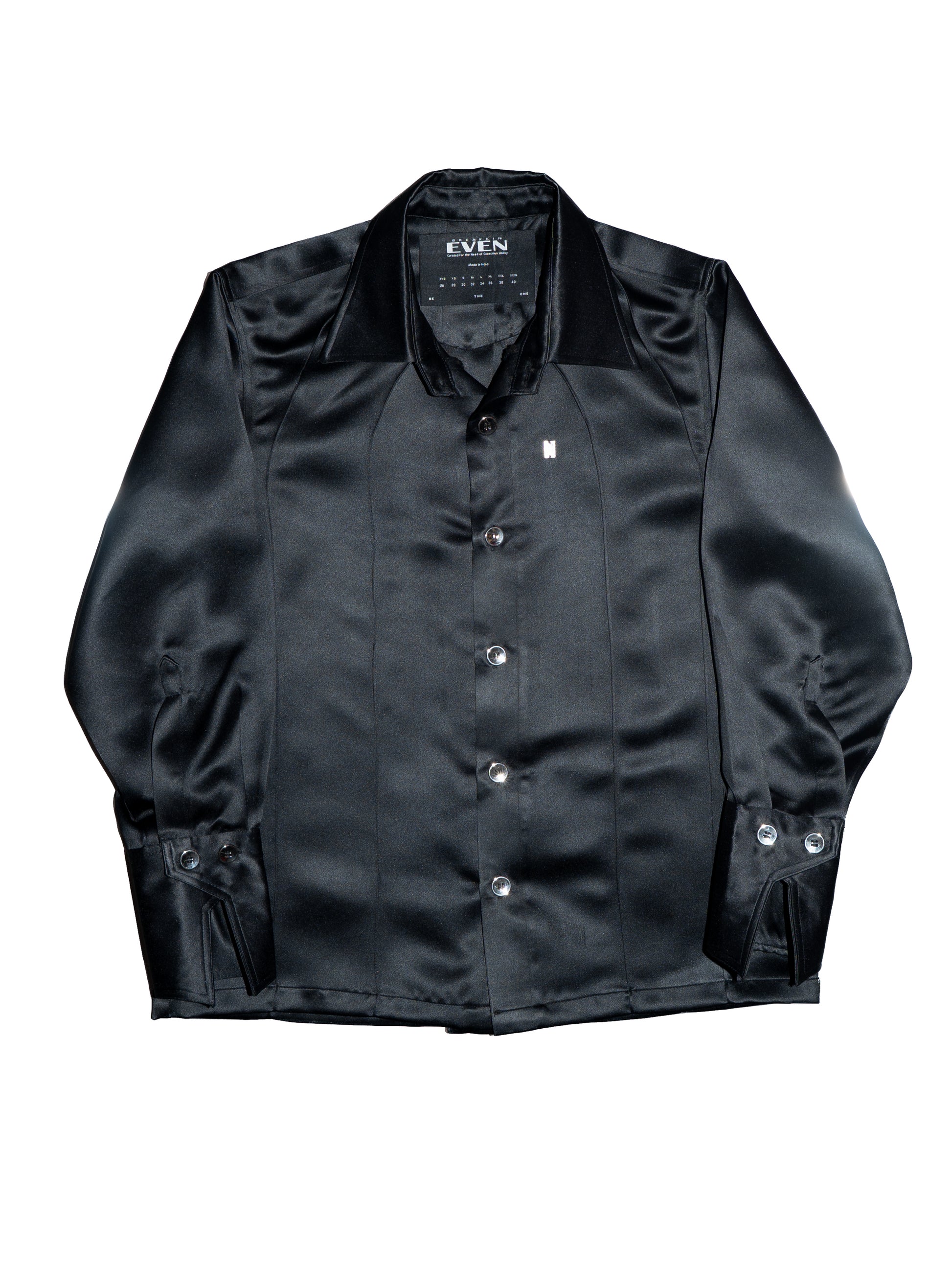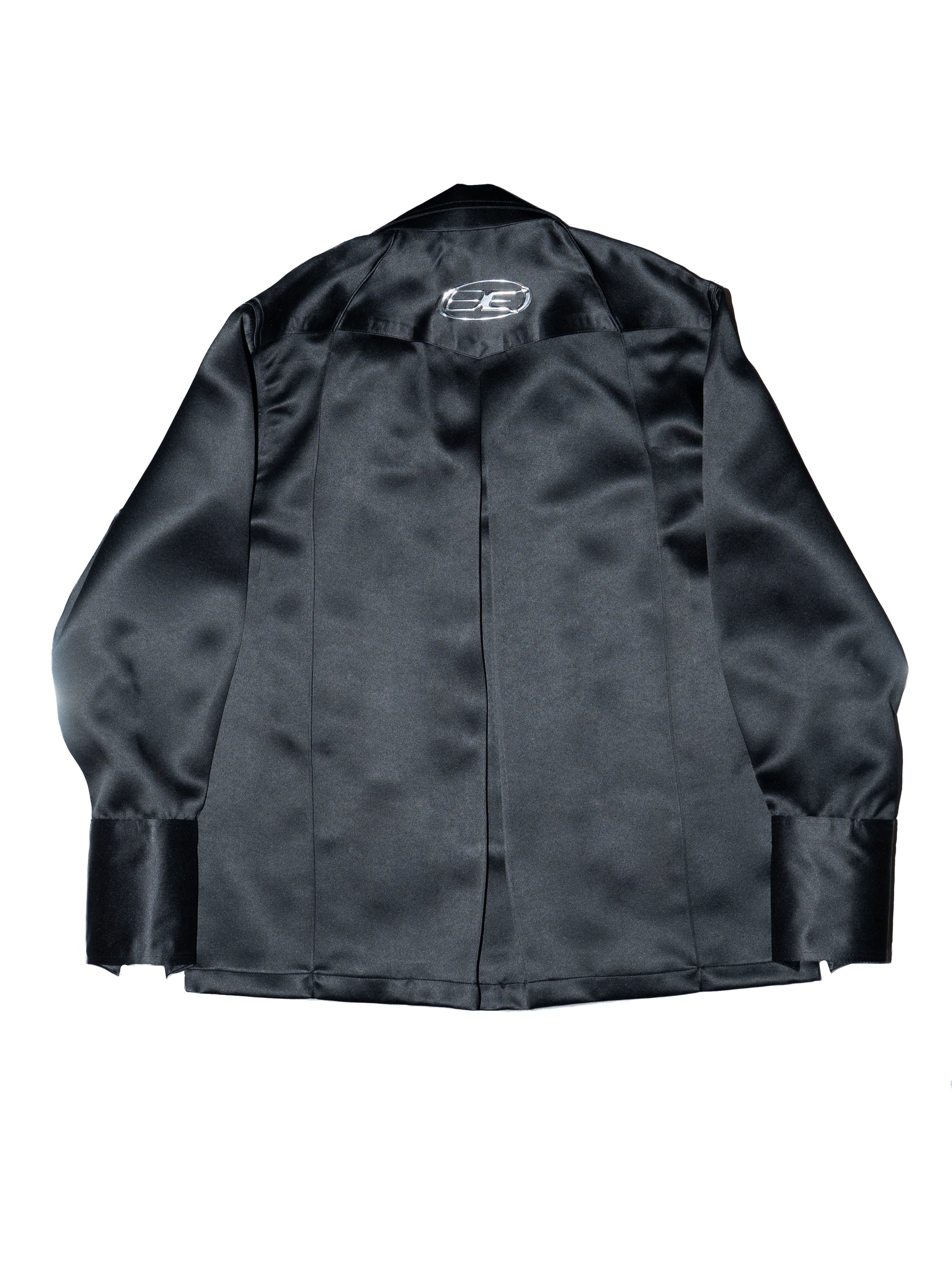 Crafted from recycled satin, this shirt offers a relaxed yet polished look. It features silver chunky buttons for a metallic edge, full sleeves with angular cuff detailing, and a pleated back with a yoke and metallic logo for a comfortable, tailored fit. Versatile and elegant, it can be styled for a refined, dressed-up look.