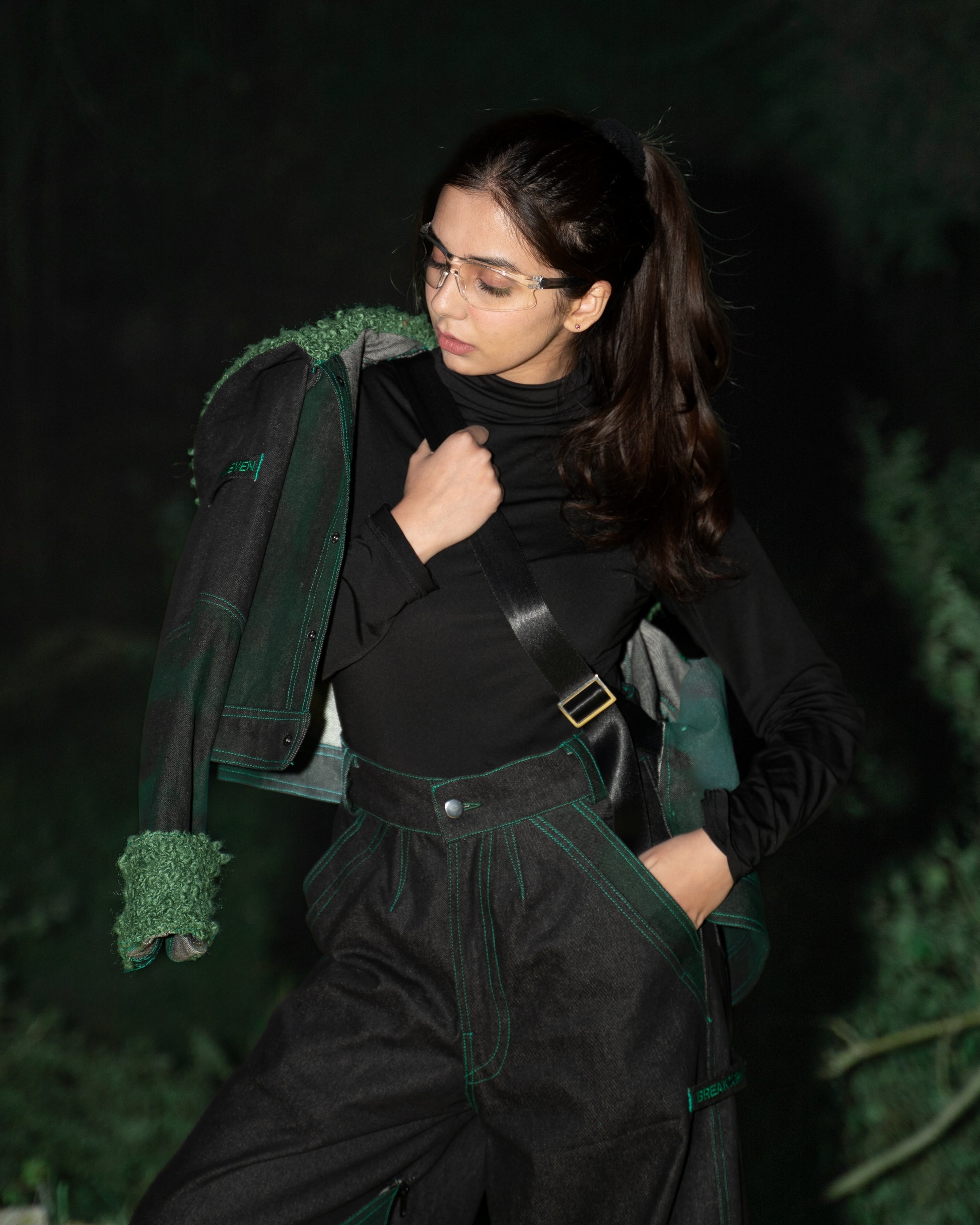 This cropped jacket is crafted from in-house treated raw denim in a bold green finish. Curved seam lines create a sleek, structured silhouette, while a large bouclé collar with zipper detailing adds a standout element. Designed for function, it features spacious interior and exterior pockets, a strap with metal adjuster for hands-free wear, and metallic snap buttons. Finished with metal studs and the dark techno green Breakkin Even logo.