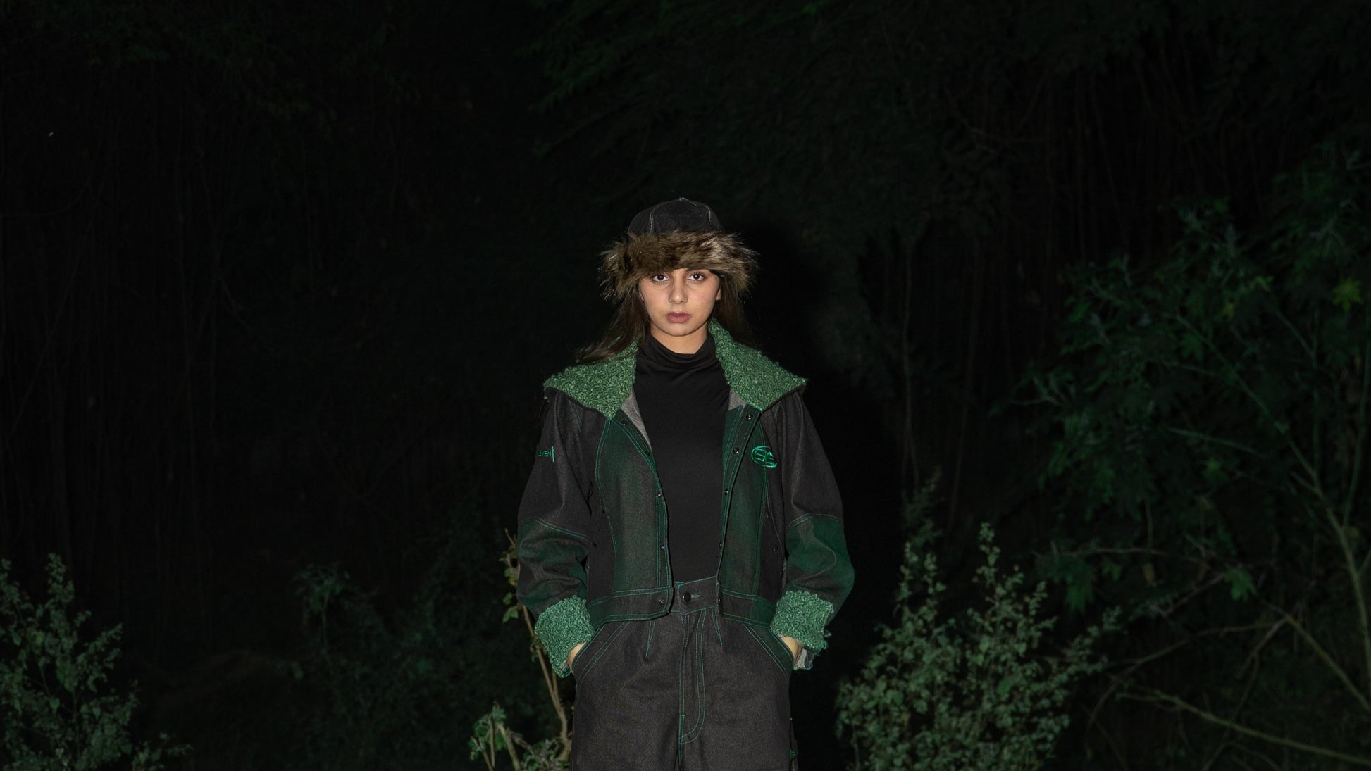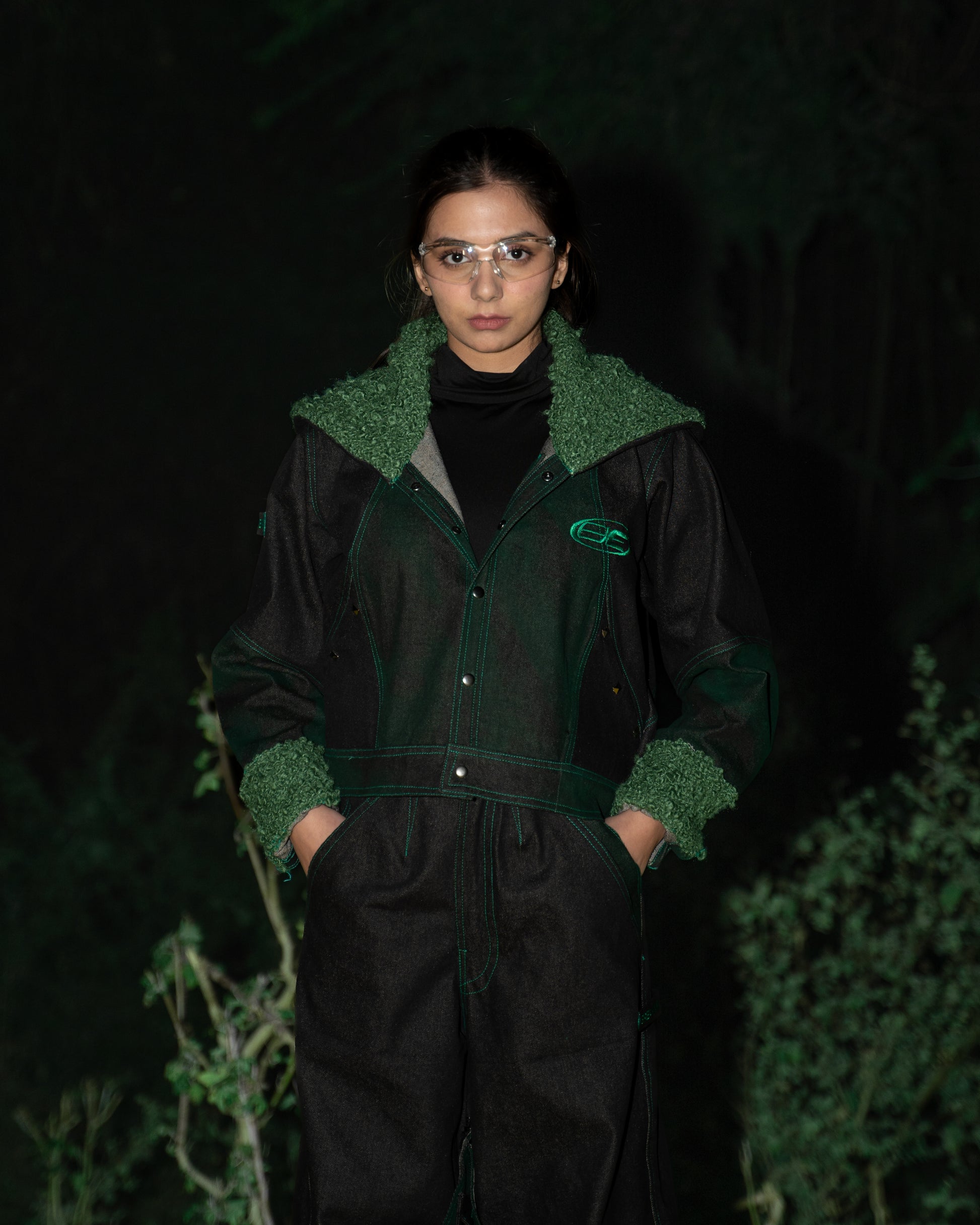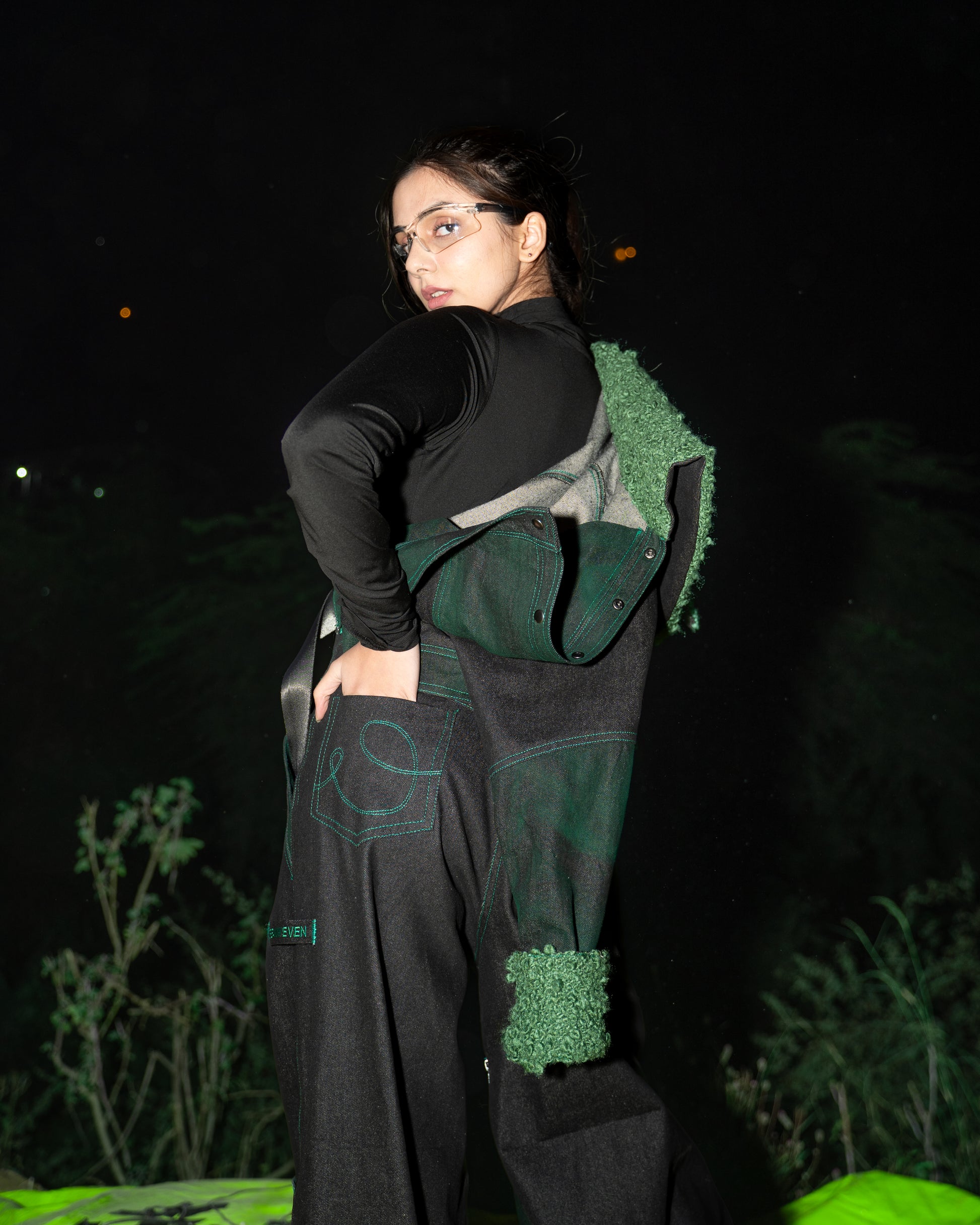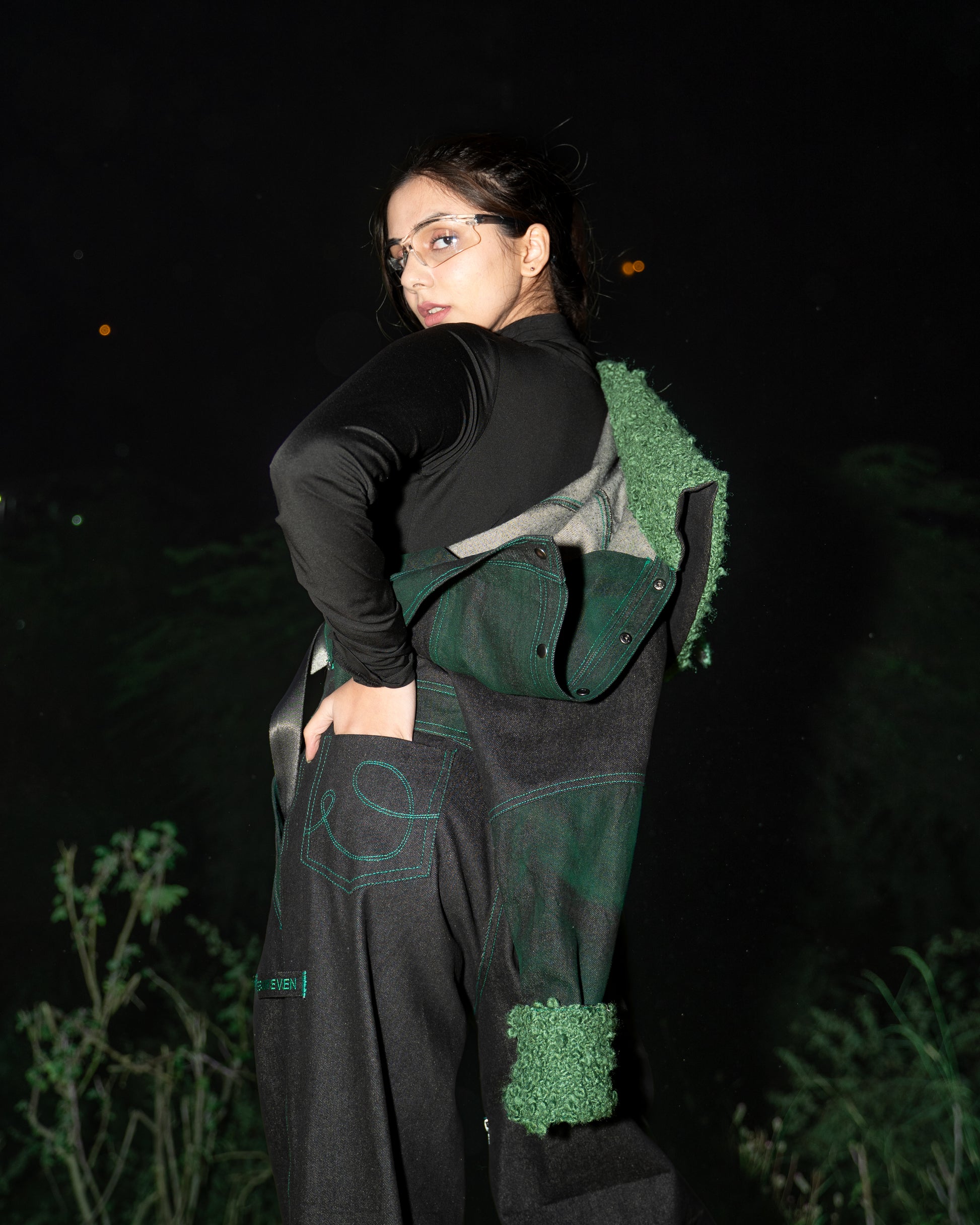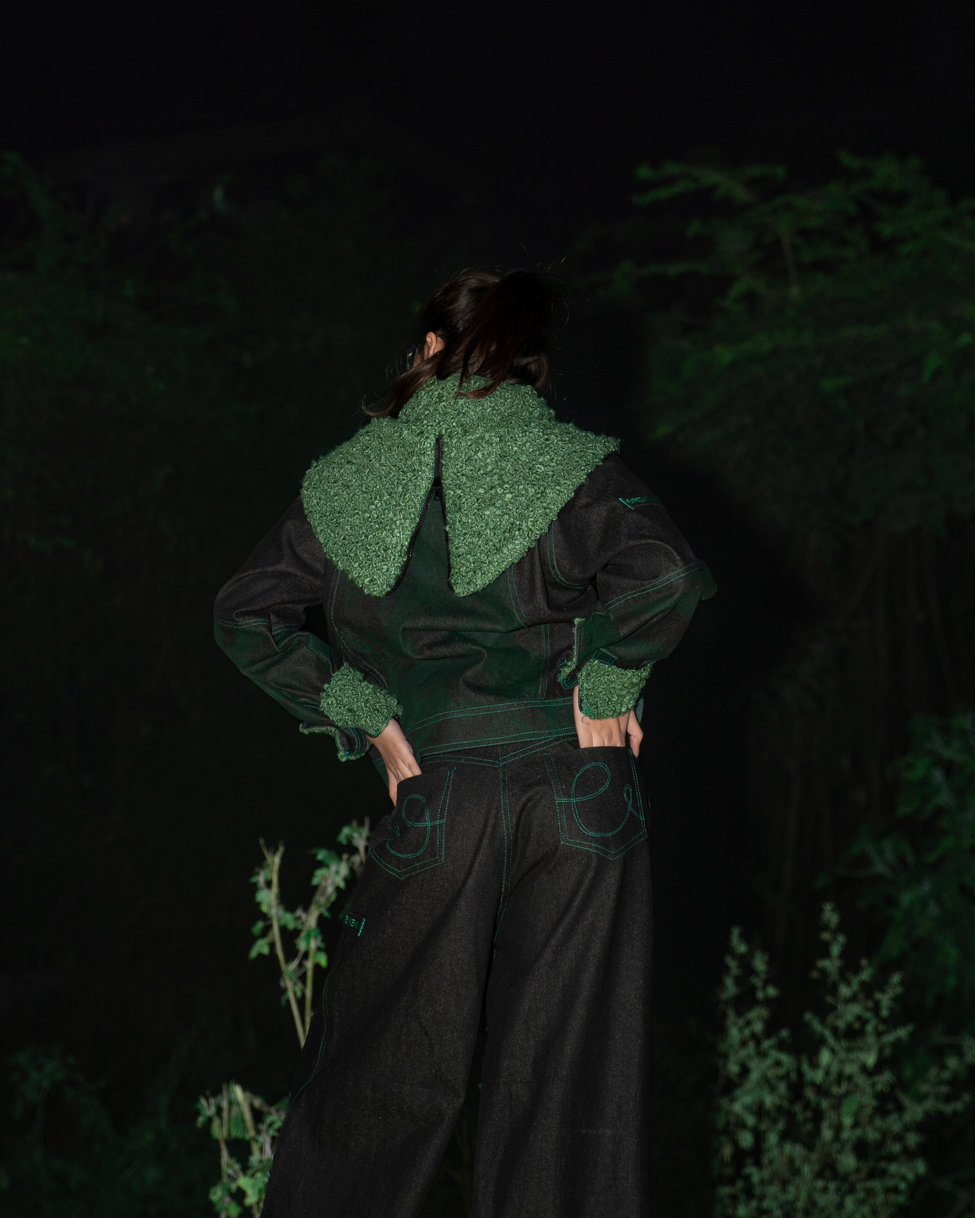 100% Raw Denim, 100% In-House Treated Raw Denim (Green), 100% Wool Bouclé Fabric, Metal Embellishments
