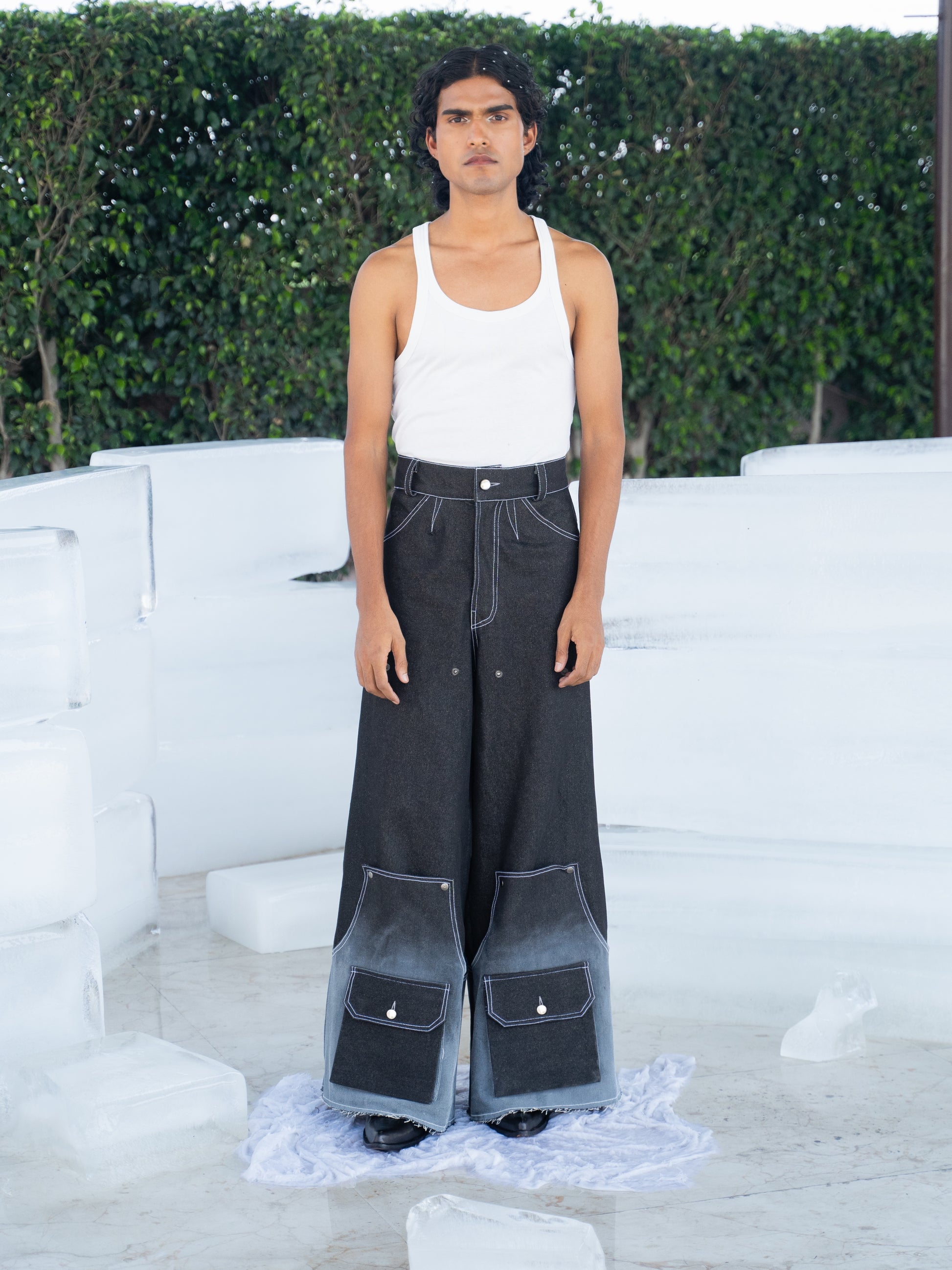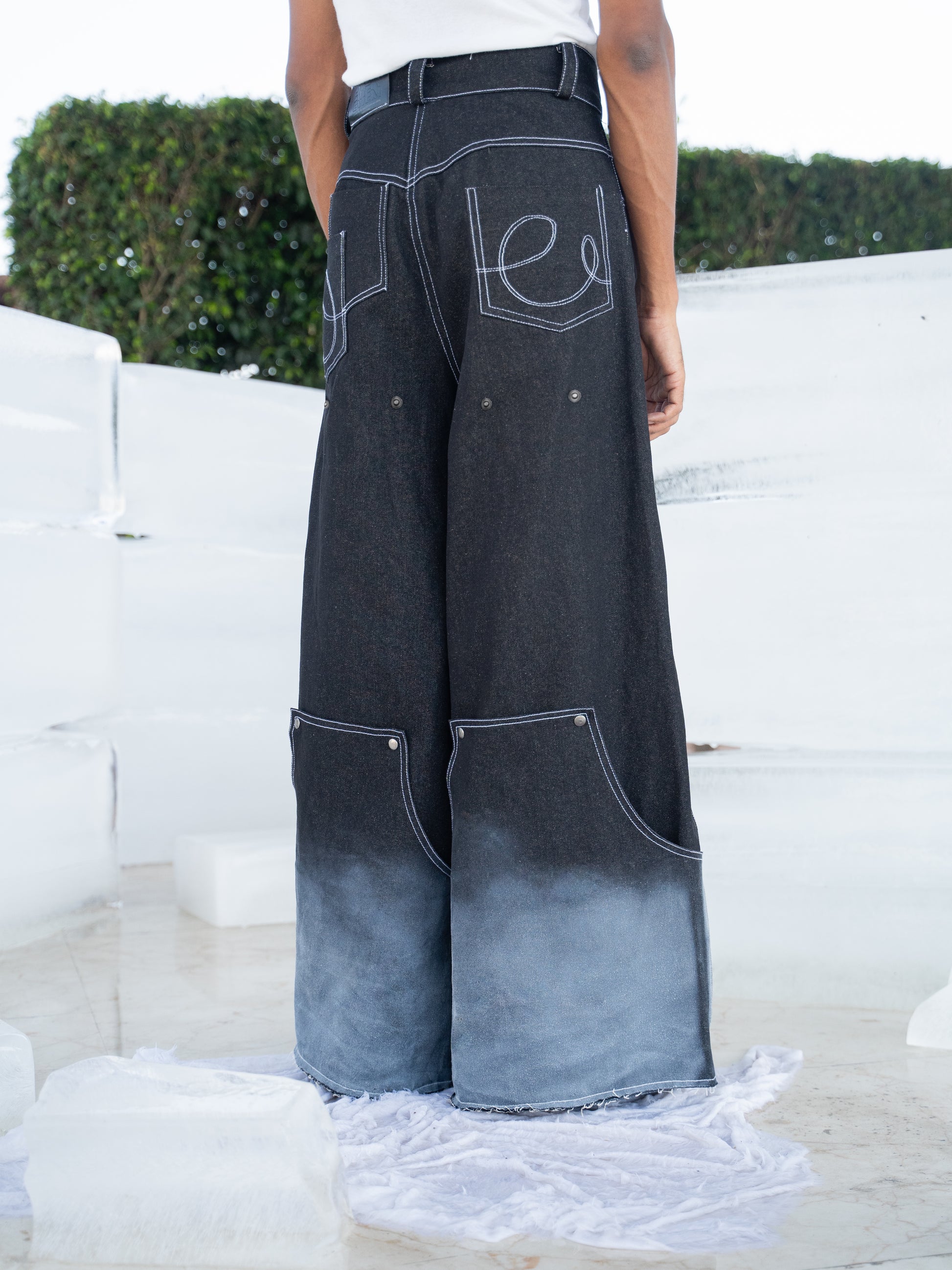 Elevate your style with our convertible frosted denim jeans, crafted from 100% raw denim in a striking frosted white. Hand-treated with fabric paint for an icy texture at the hem, they feature 11 functional utility pockets, contrast stitching, and durable metal hardware. Snap closures let you switch from jeans to jorts in seconds—versatile, bold, and built for rebellion.