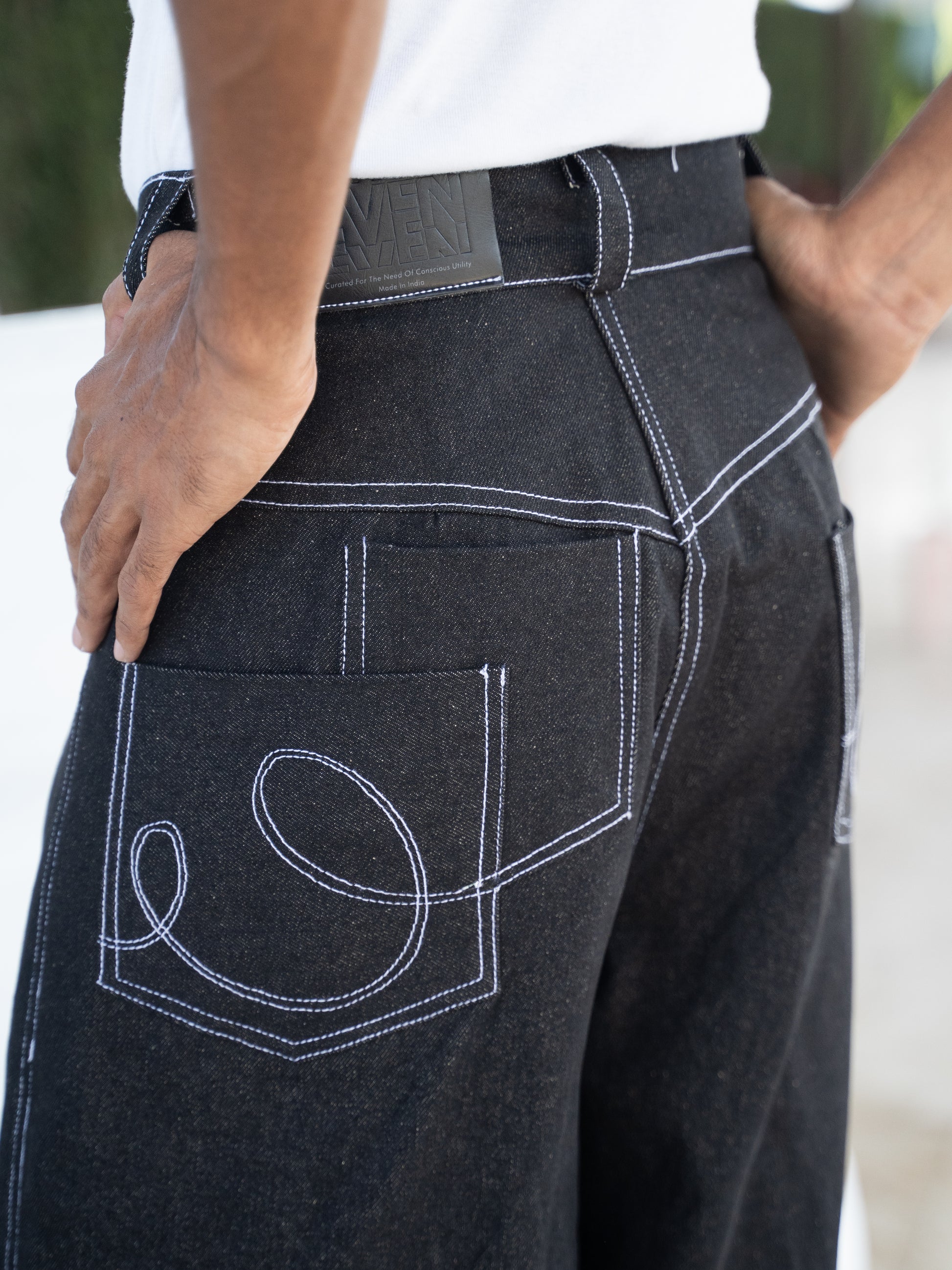 The denim fabric is raw and unbleached. The colour in the denim is hand done by us. We suggest to spot clean the denim always. If there is a need of washing, inside out hand washing in cold water is recommended. Black colour of the denim will bleed because of no presence of any heavy washing/ bleaching technique used. You can use a small cup of sceneted vinegar in your hand wash bath to decrease further colour bleeding. Line dry inside out. High iron, inside out.