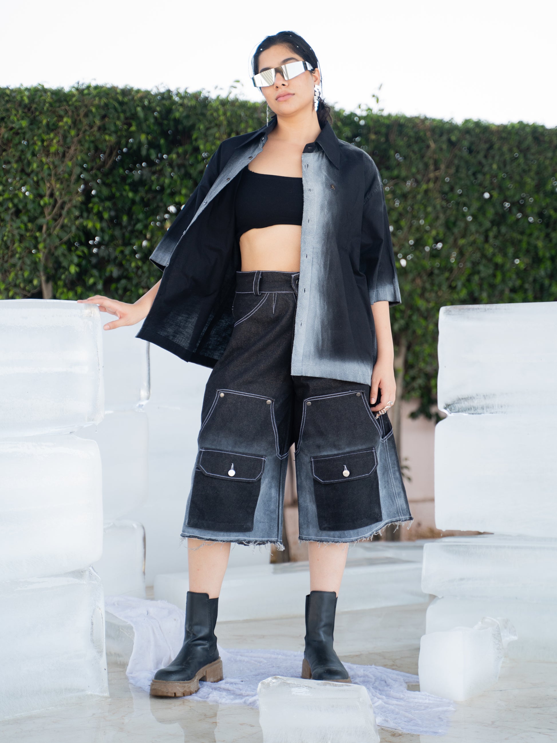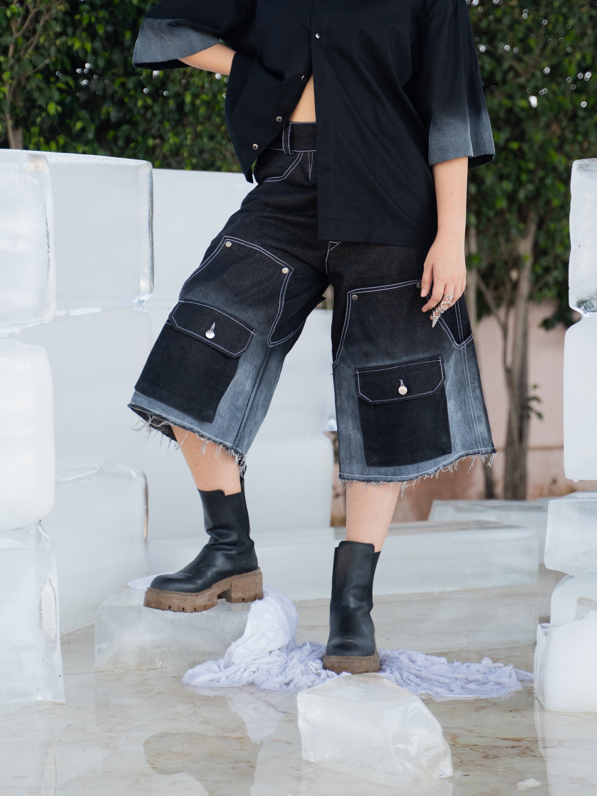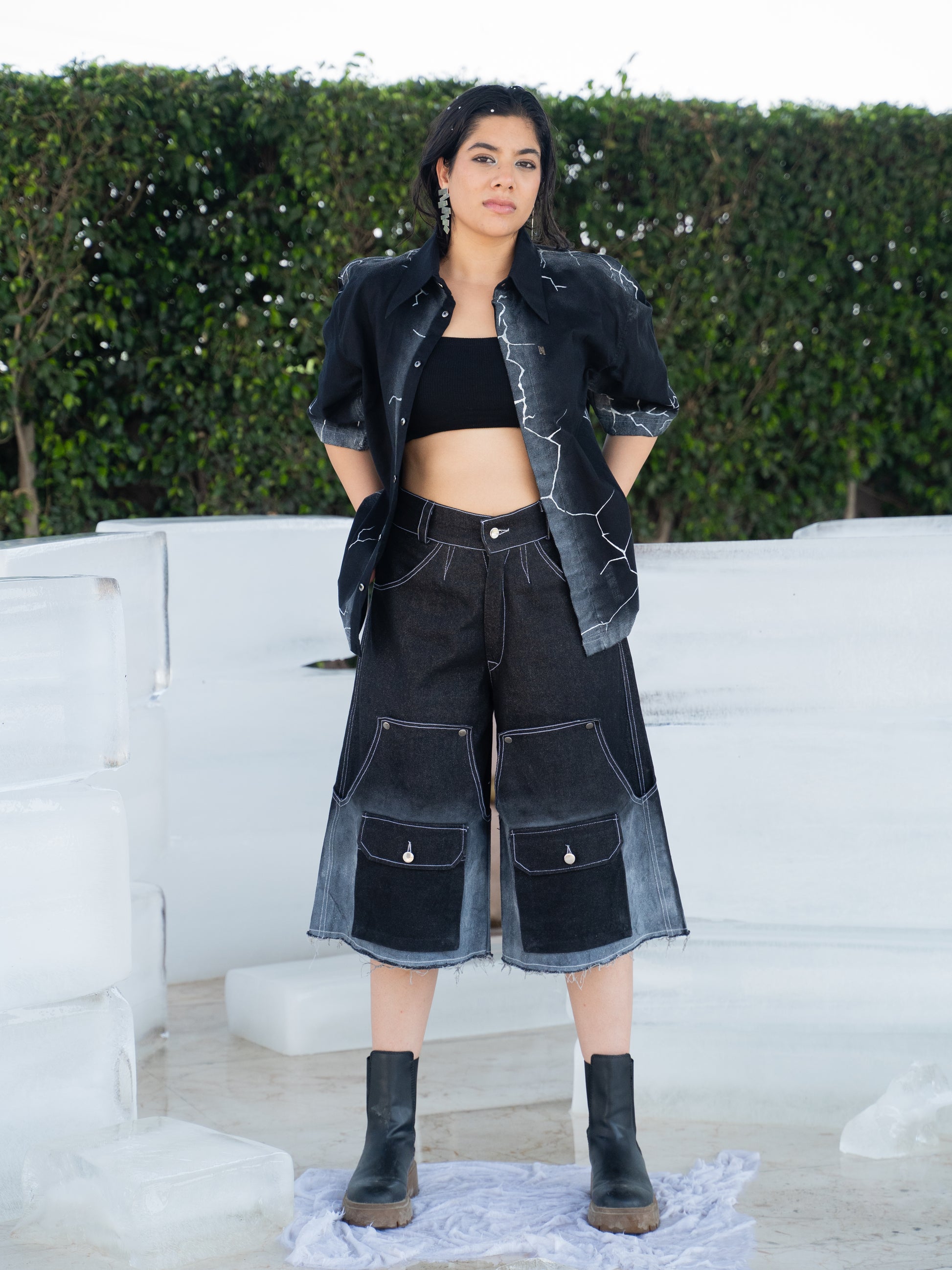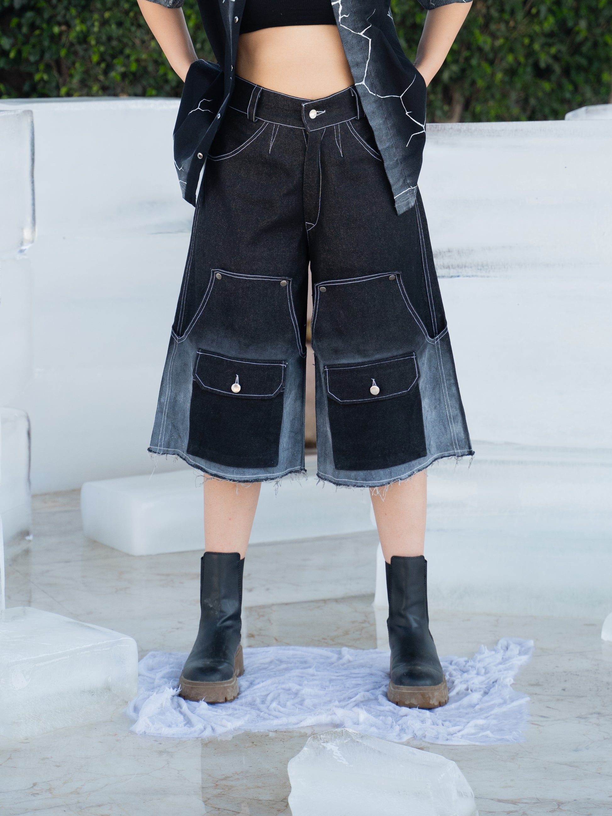 These 100% raw denim jorts in frosted black are hand-treated with fabric paint for a bold, icy hem. With 11 utility pockets, contrast white stitching, and metal hardware, they blend edge and function. Designed for rebels who move with style.