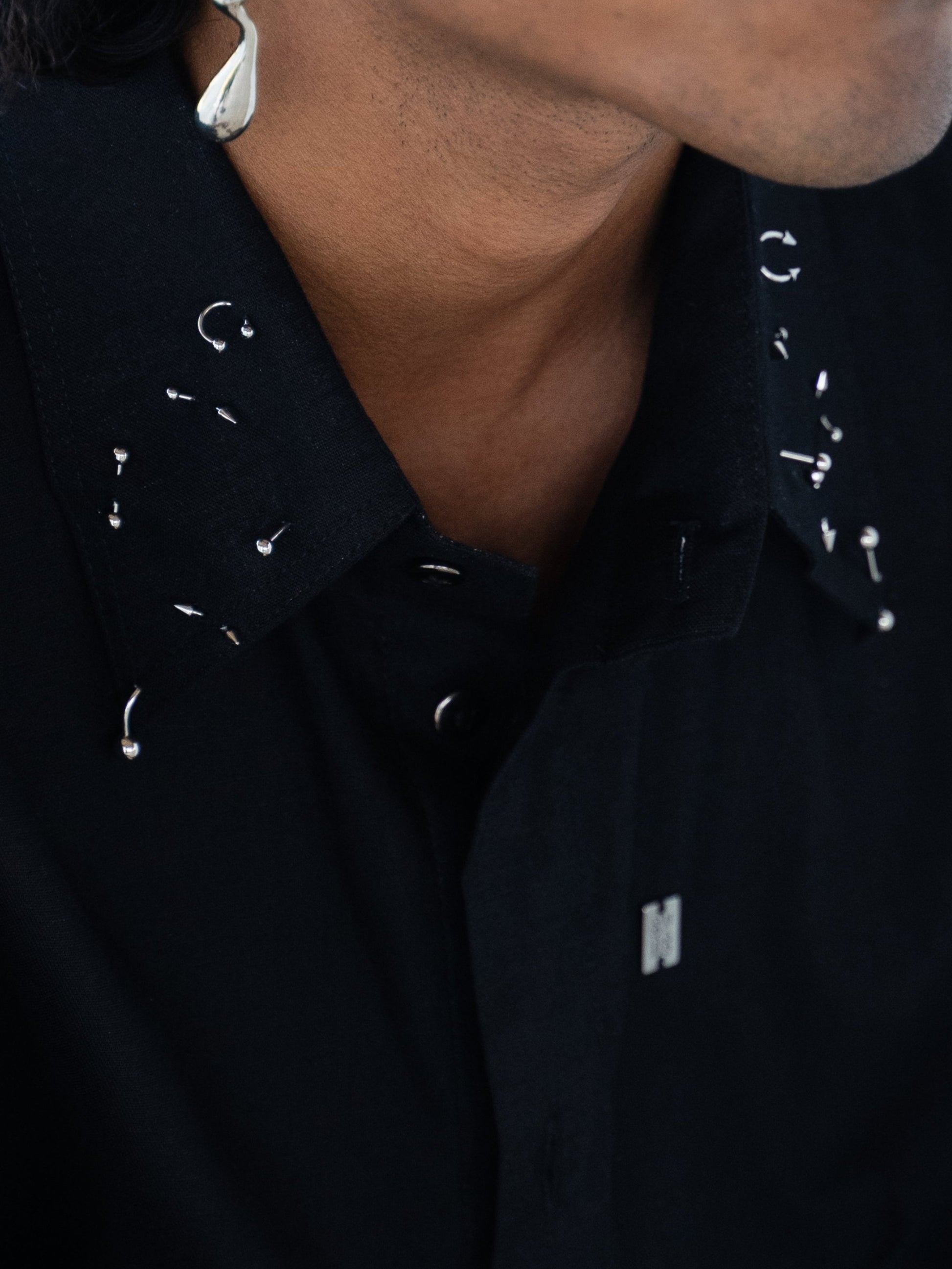 To maintain the quality of your shirt, avoid washing whenever possible and opt for spot cleaning instead. If washing is necessary, hand wash in cold water with a mild detergent, treating stains gently and avoiding harsh scrubbing. Be sure not to wash the collar directly, handwash it if it has metal embellishments attached. For best results, line dry the shirt.