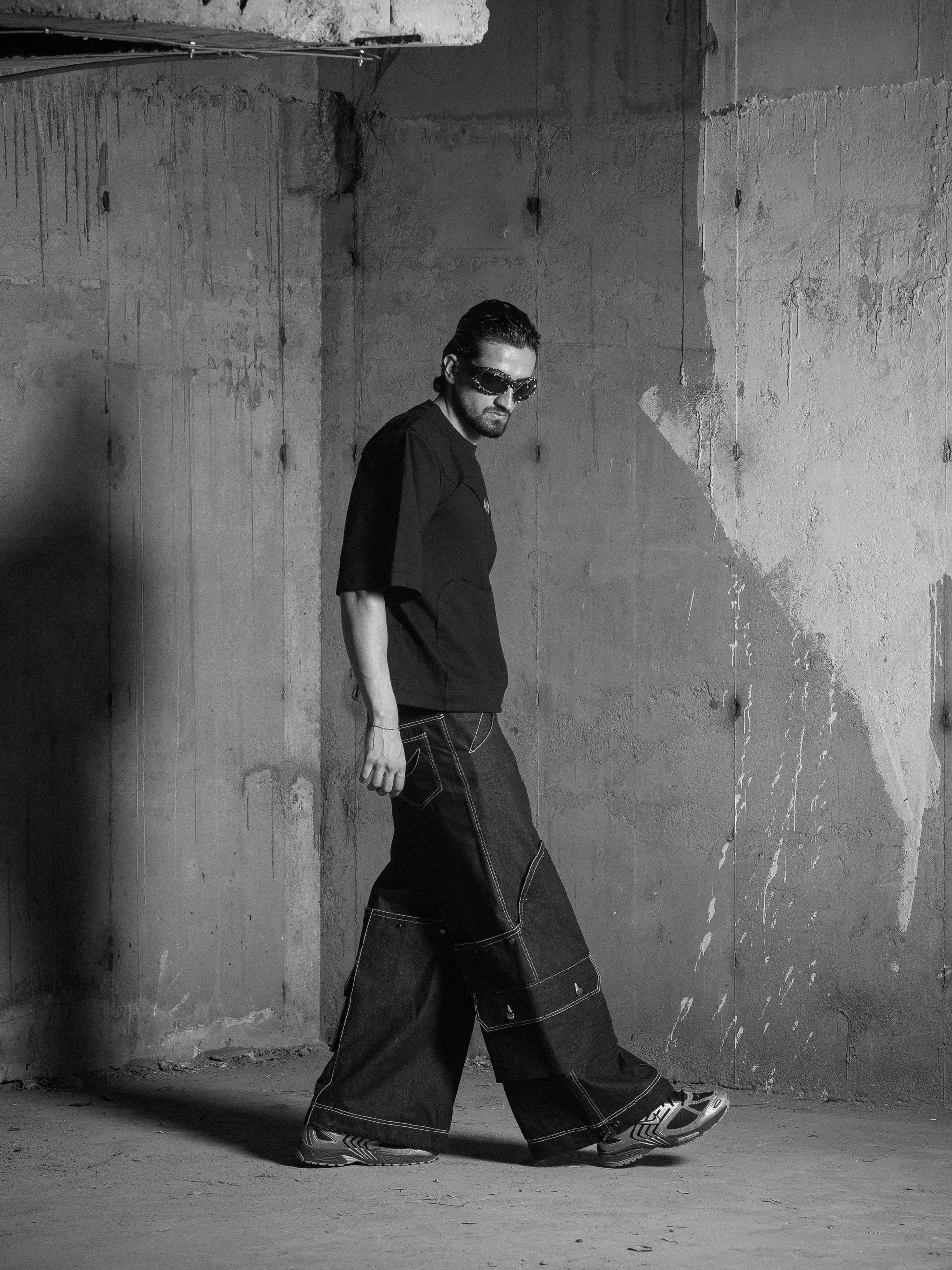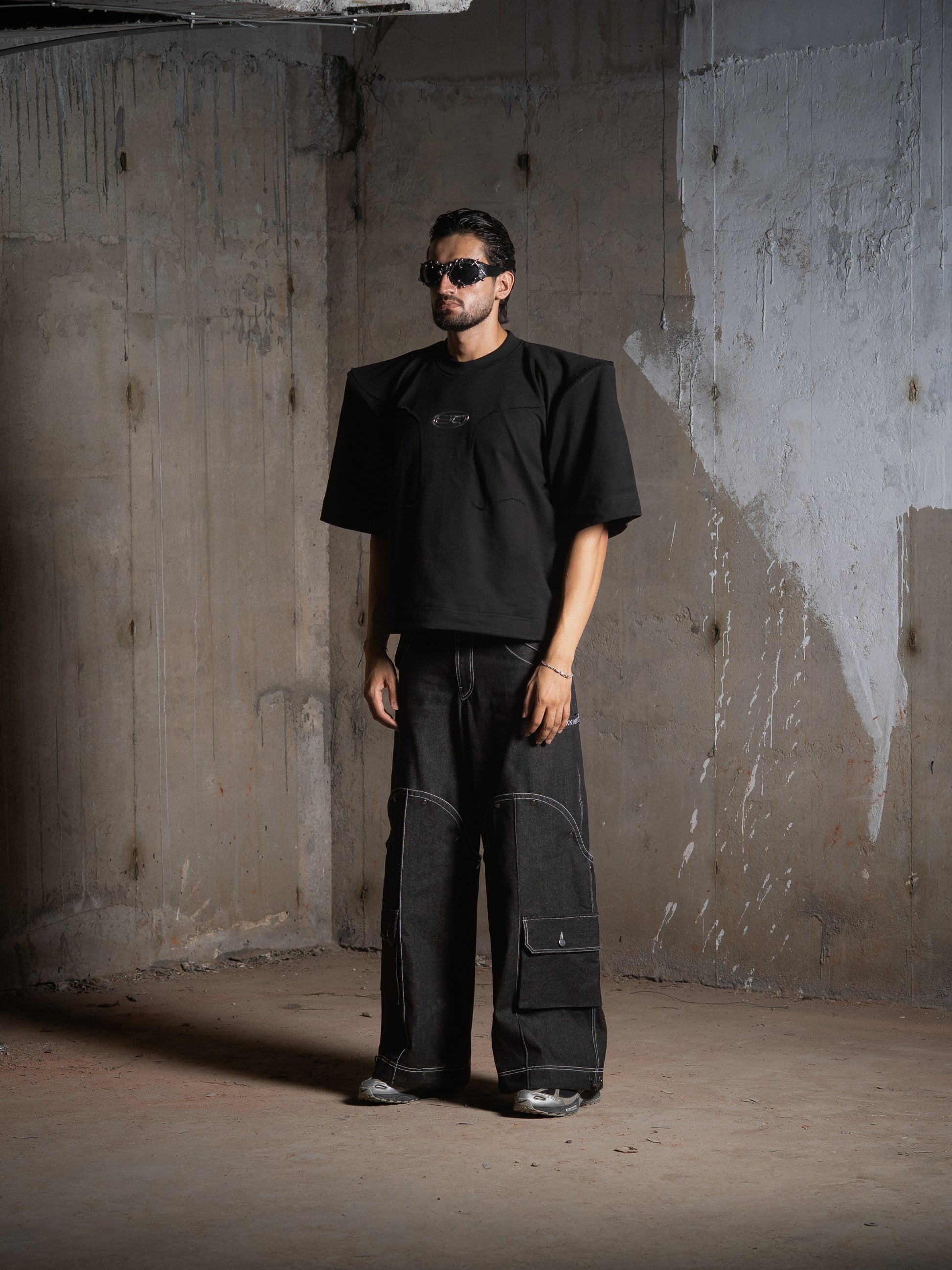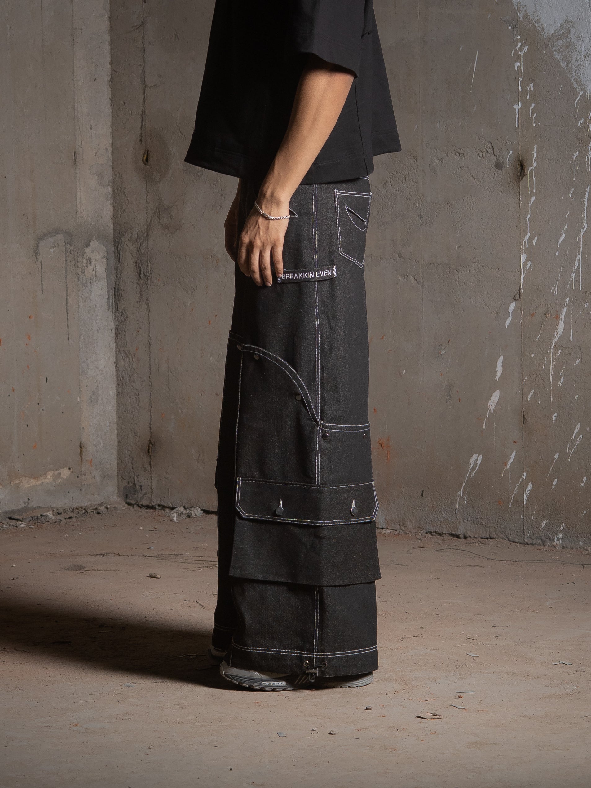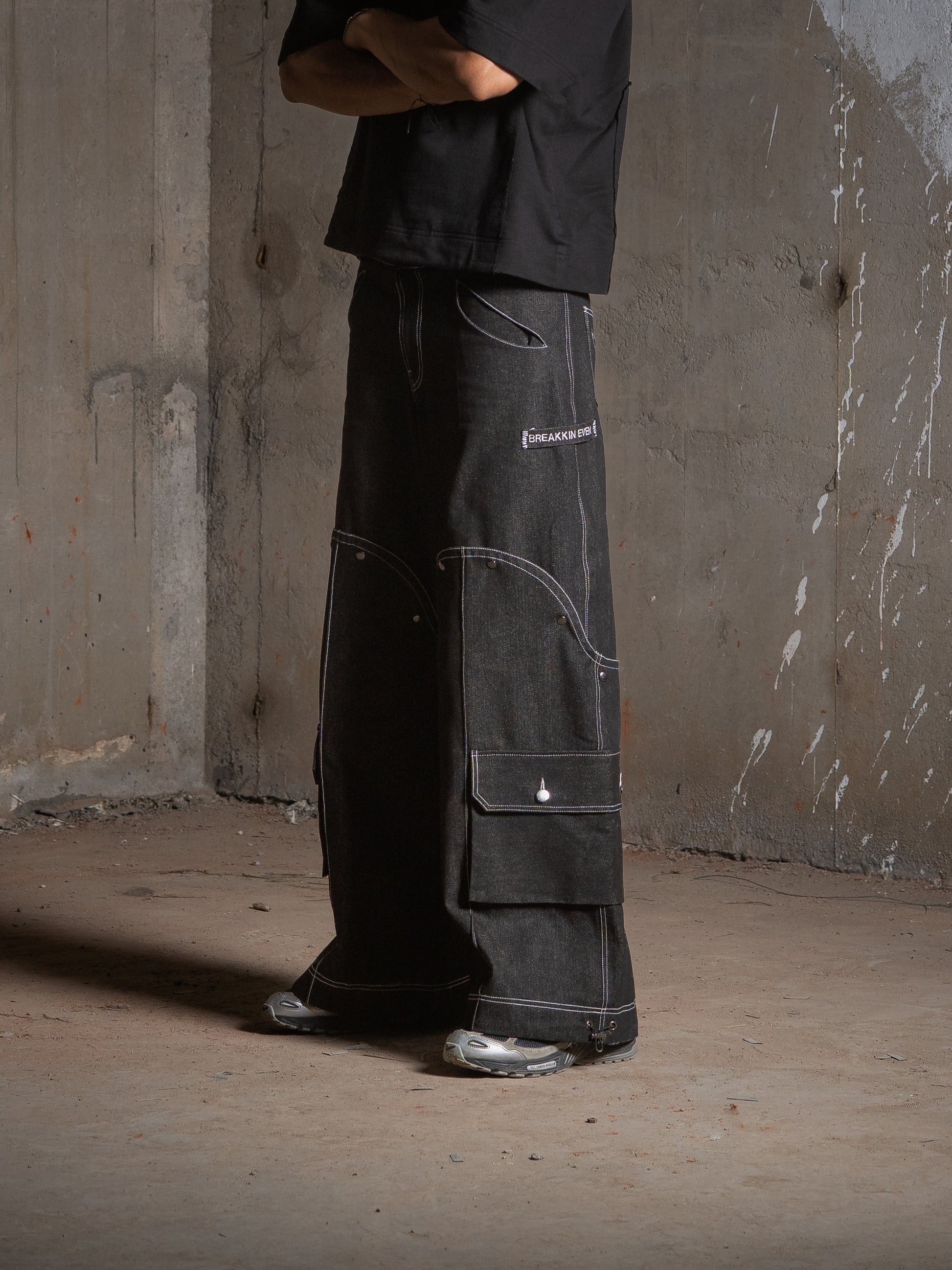 Inspired by the heavy armours worn by ancient warriors, this updated version of our best-selling Jort Jeans is crafted from raw denim with a baggier fit. Detachable panels convert the jeans into jorts using metallic snap buttons, blending bold design with everyday versatility.