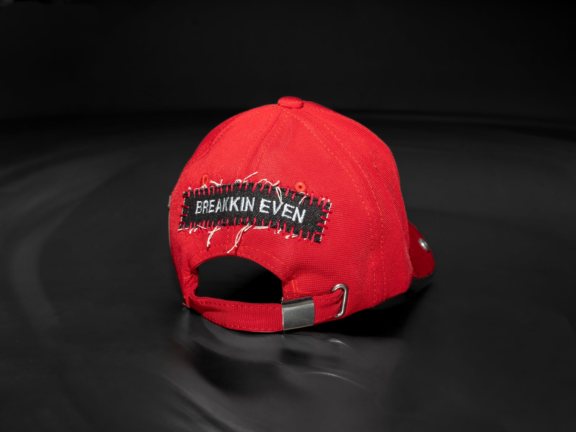Machine-embroidered “JUST SCREW IT” patch hand-stitched on the front, “BREAKKIN EVEN” machine-embroidered patch hand-stitched on the back, upcycled reconstructed leather patch on the back, industrial screws on the brim, and adjustable strap.