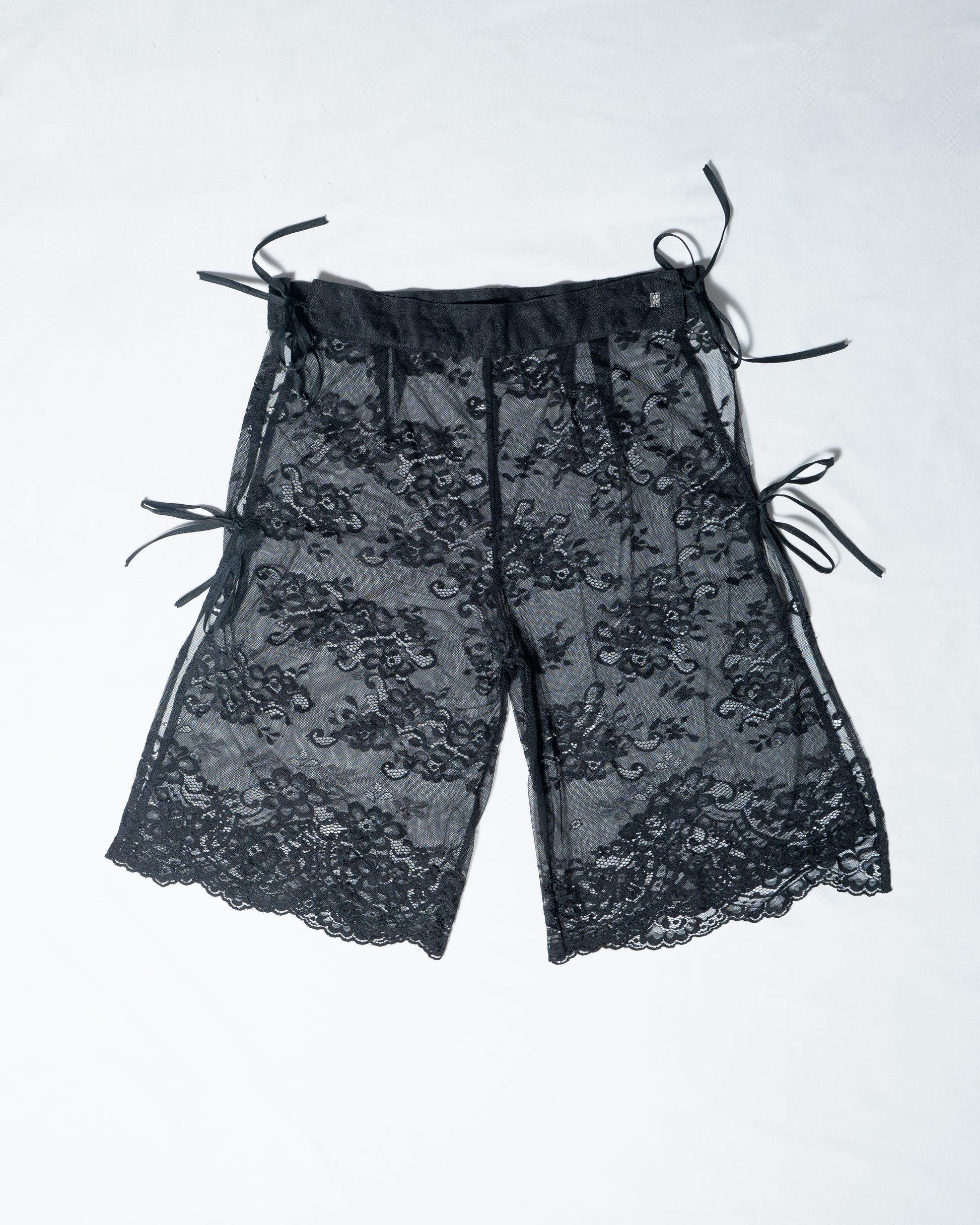 The Lace Jorts Overlay is a bold expression of raw elegance and layered versatility. Crafted from semi-transparent lace, it features a fluid silhouette that drapes effortlessly, adding texture and dimension to any outfit. Lightweight and adaptable, it can be worn open for an ethereal, free-flowing look or tied along the seams for a more sculpted shape. Whether layered over fitted or oversized pieces—or worn solo as a statement—this overlay offers a striking contrast to bold, structured forms.