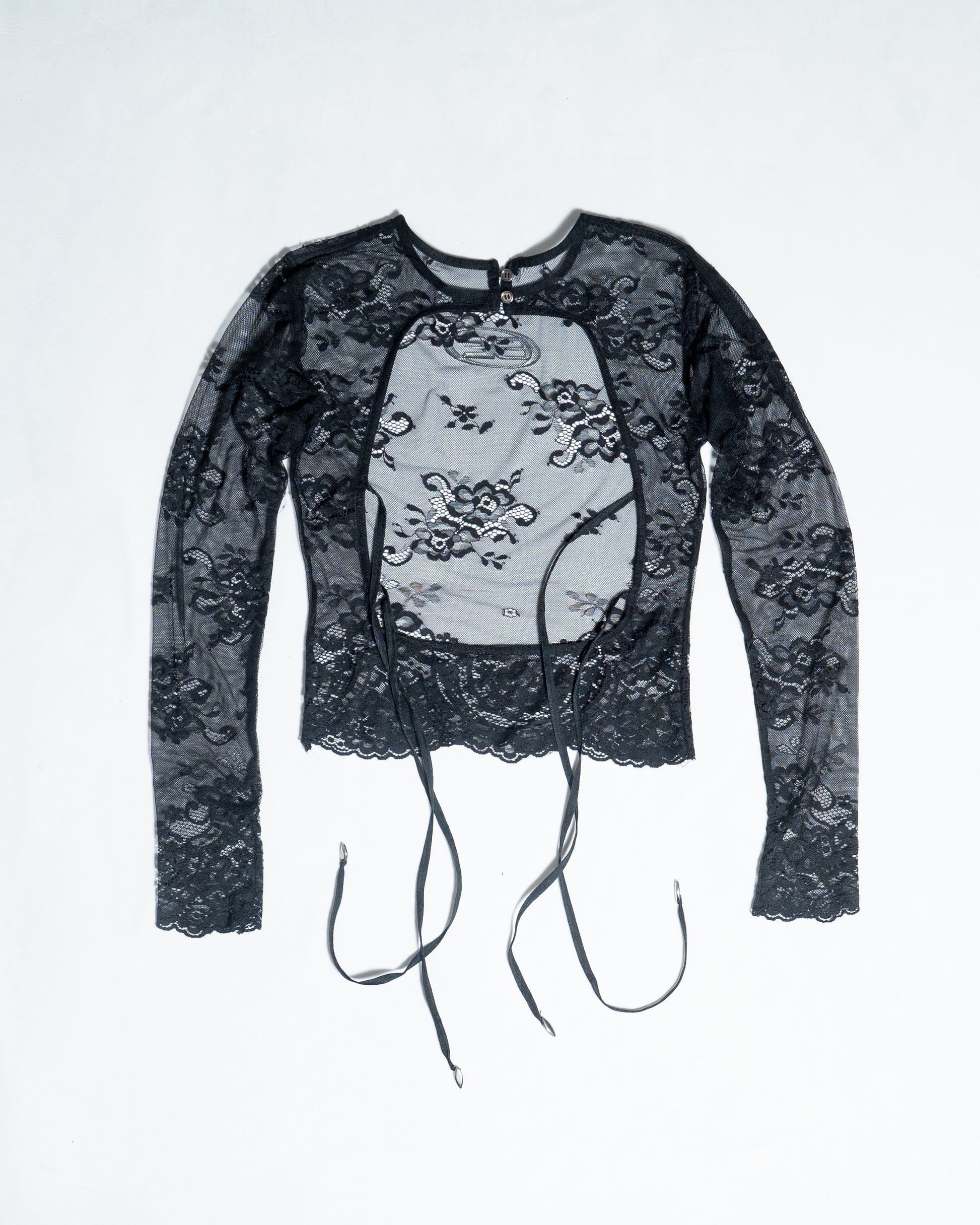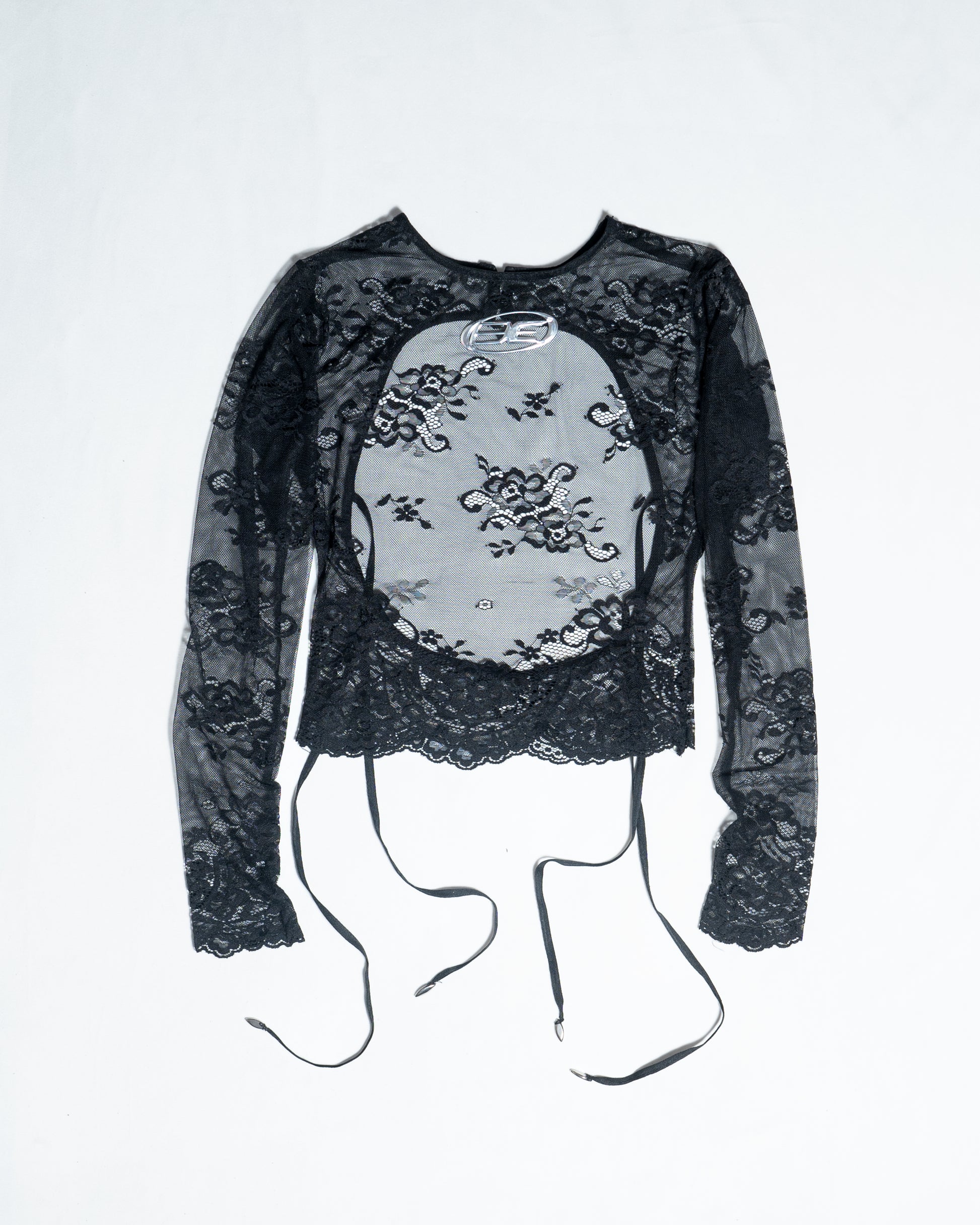 The Lace Skin Top is crafted from sheer, intricate lace with a fitted silhouette. It features a high neckline, extended sleeves, raw-cut edges, a cut-out back with delicate lace tie-ups, and a metallic BE logo at the front.