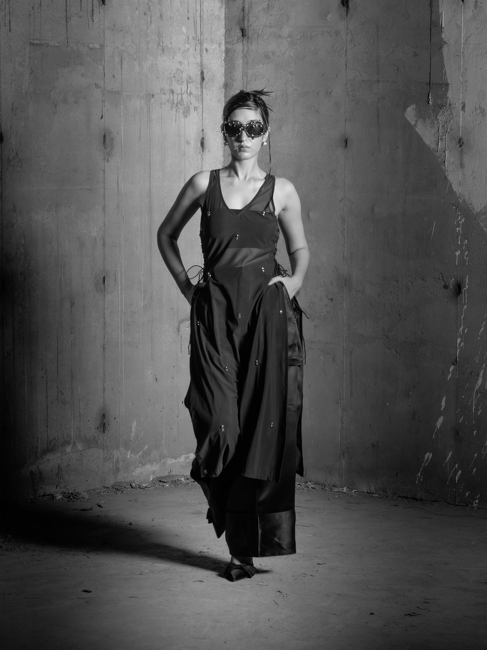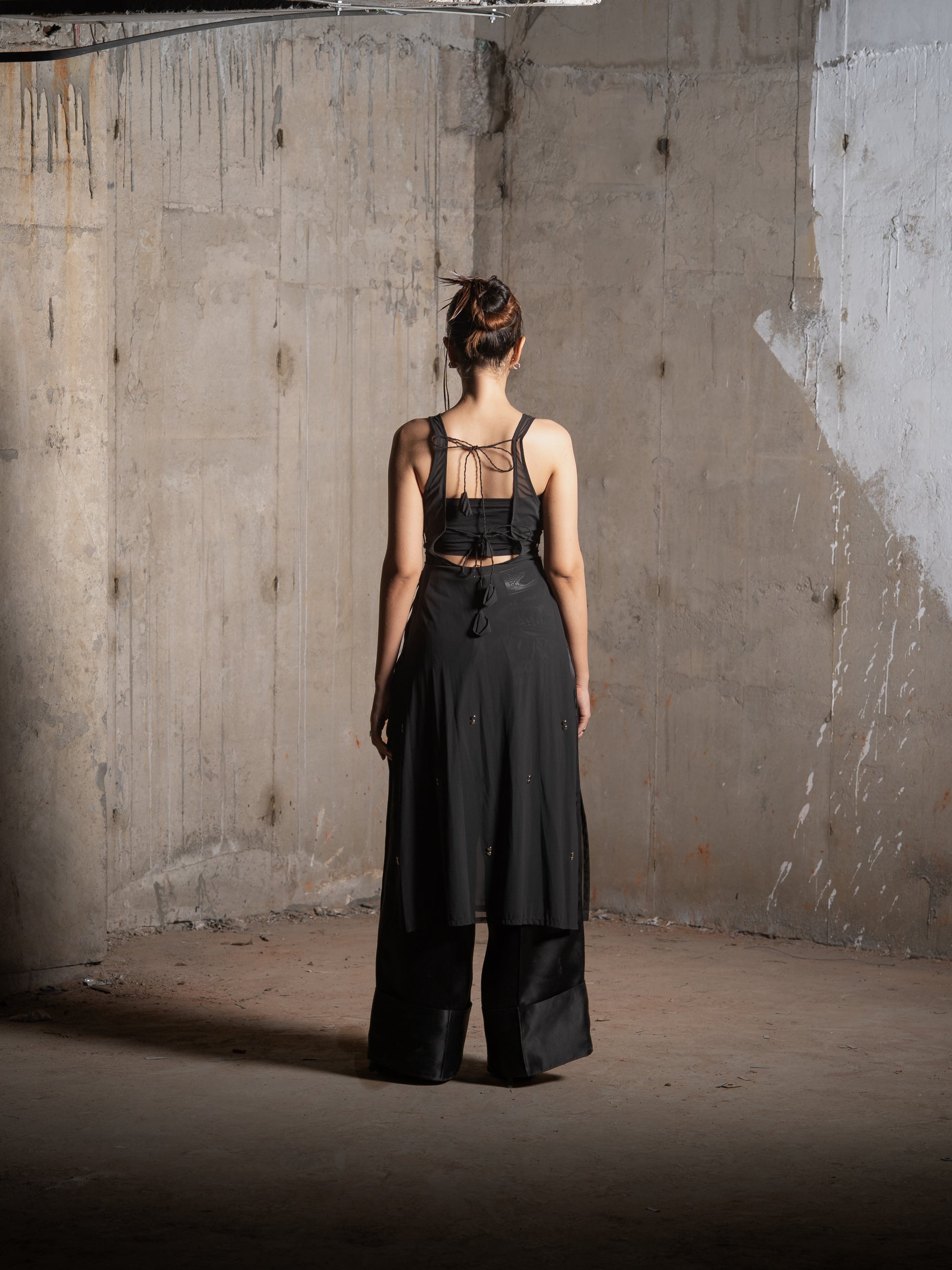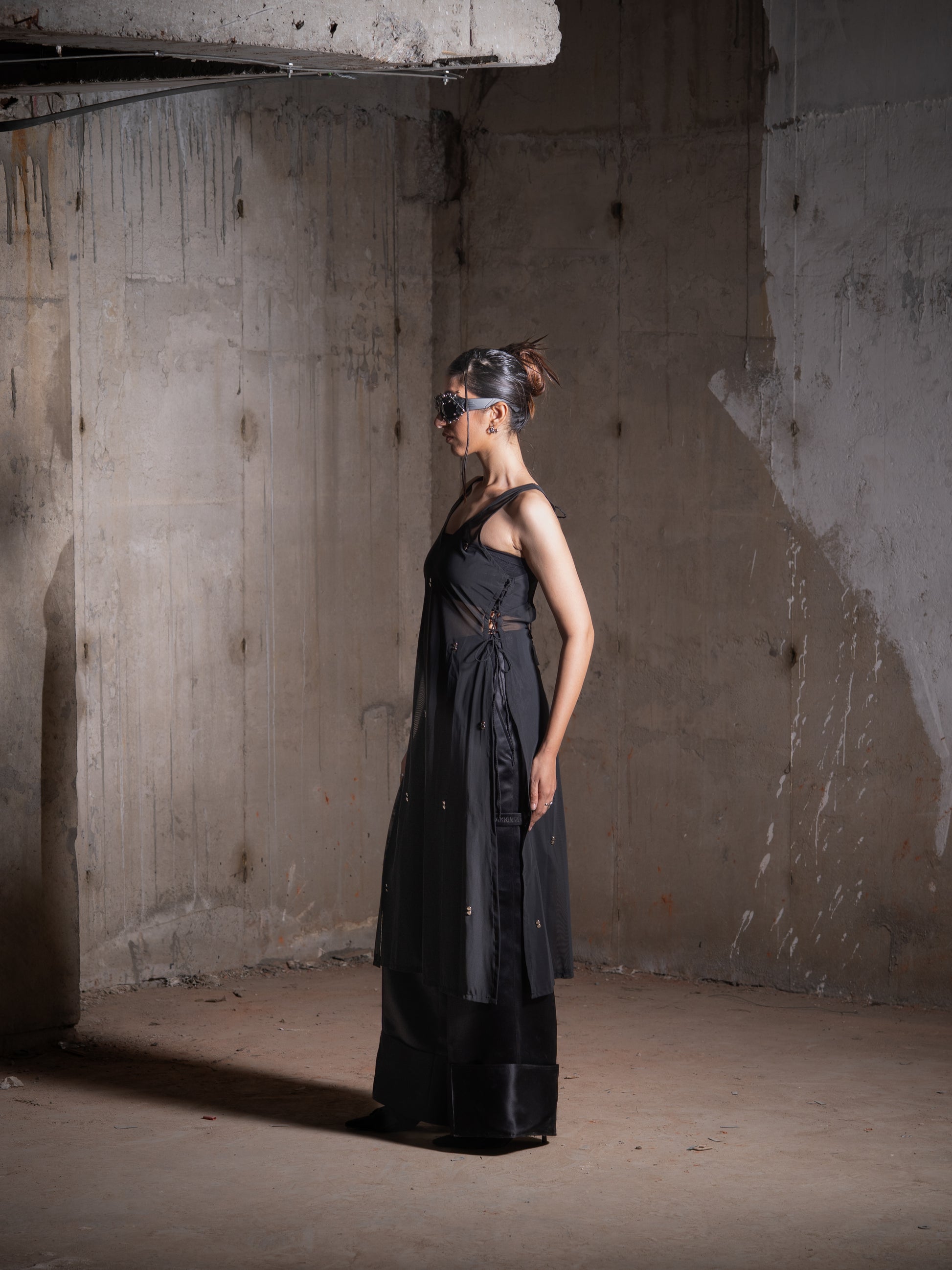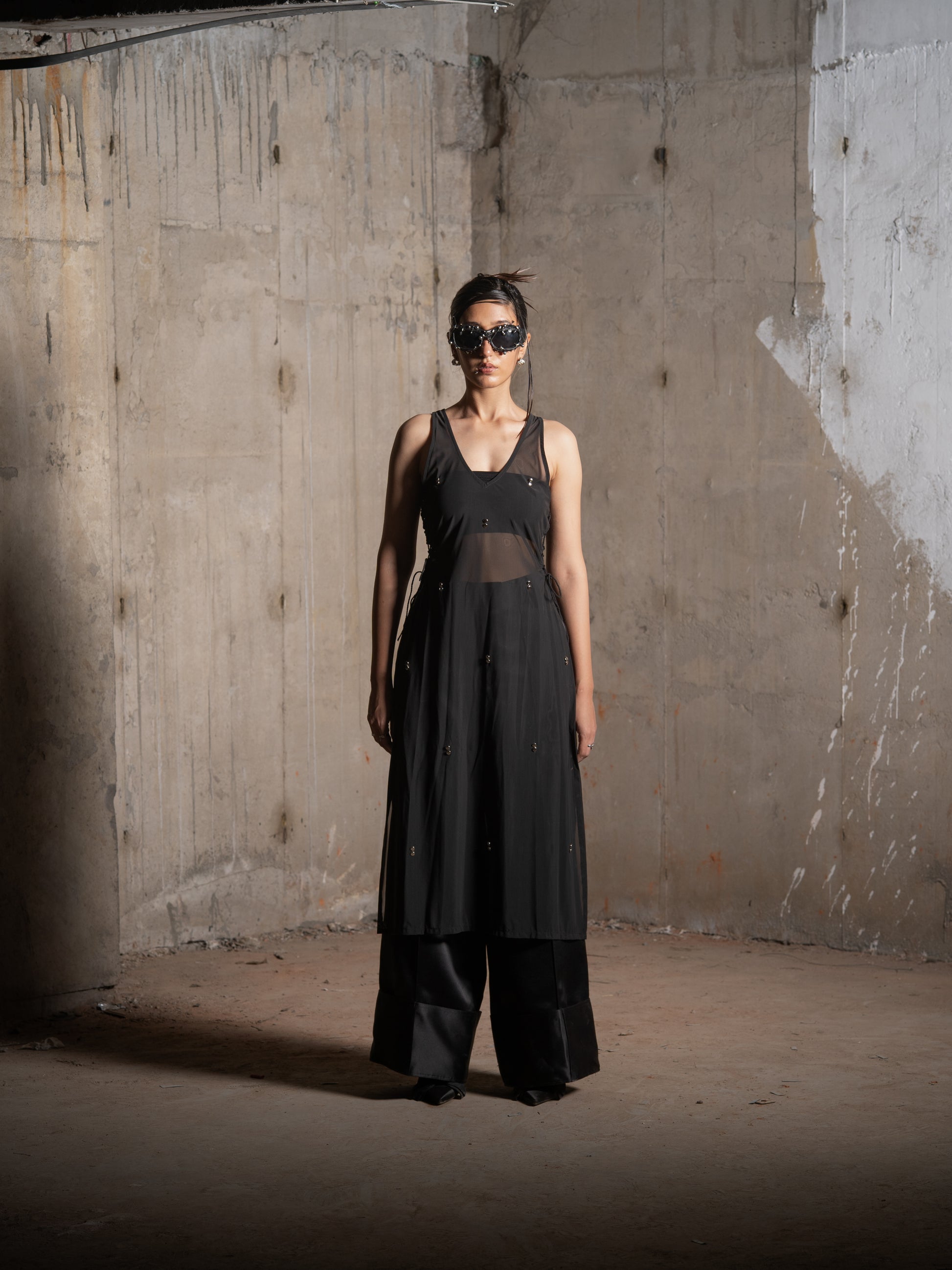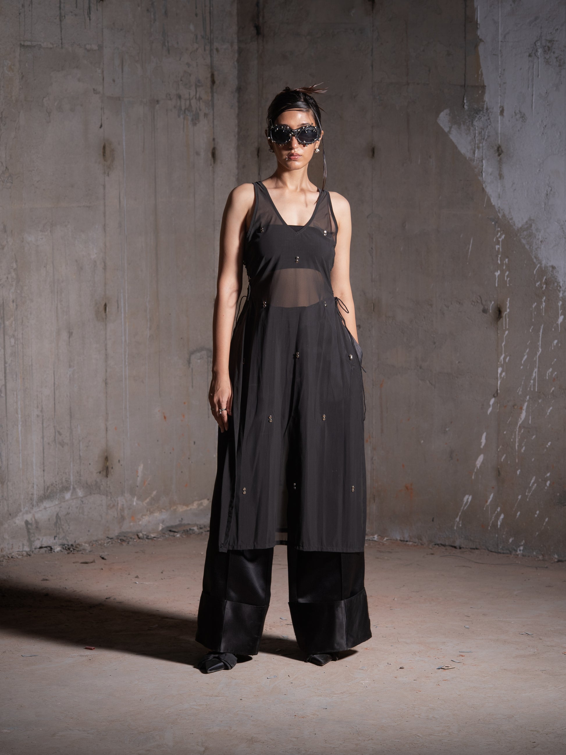 Made from stretchable power mesh, this transparent tunic is designed for versatile layering. Open at the side seams with adjustable drawstrings to suit different body shapes, it features a V-neckline, a backless design, and metal embellishments for a striking finish. The fabric adapts to your body for a fitted look or can be worn loose as a layering piece.