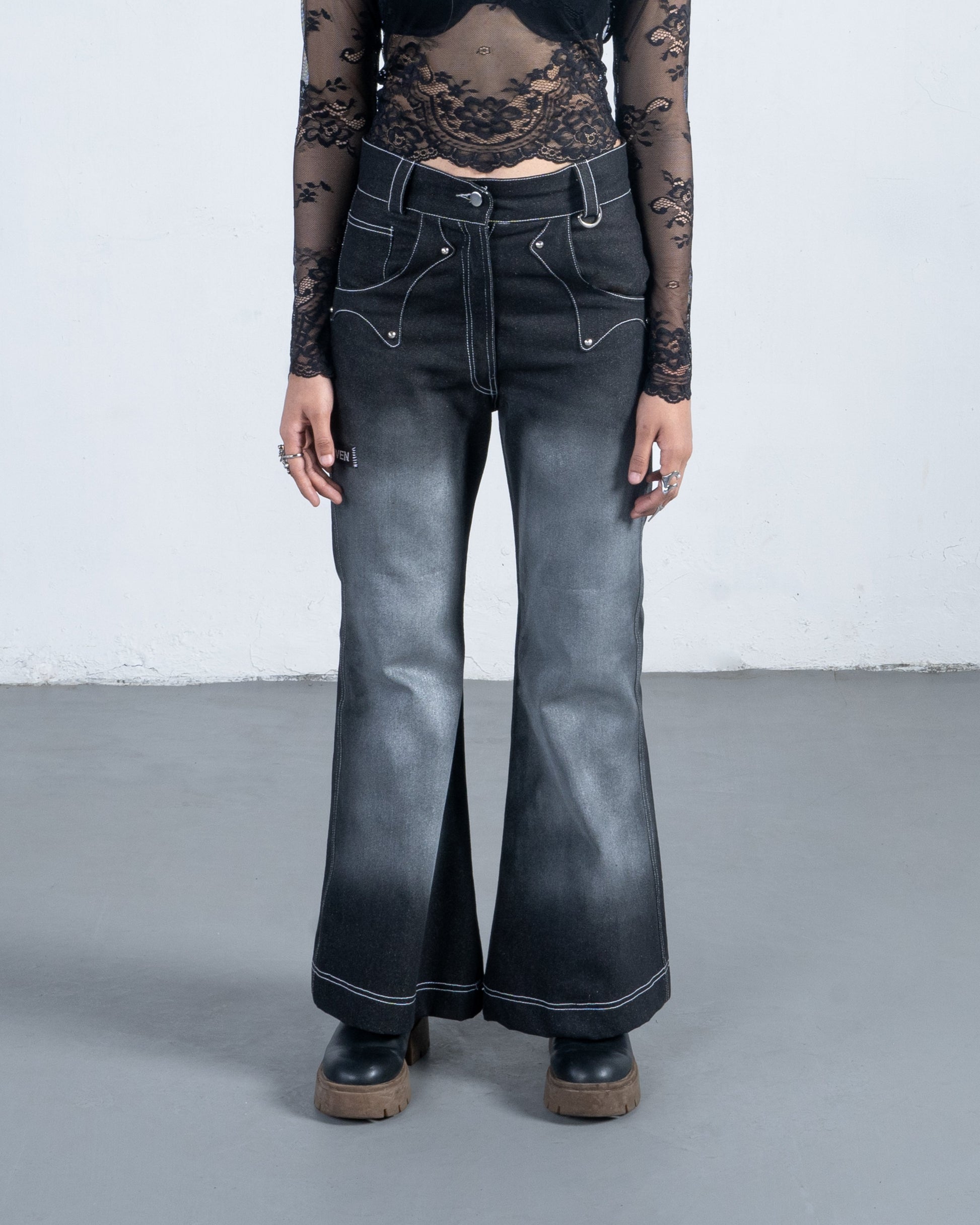 The Mayhem Bootcut Jeans are crafted from premium raw denim with a hand-treated silver metallic finish, creating a gradient effect inspired by distressed metal. A metal ring and Breakkin Even side strap add functional detail. The structured bootcut silhouette offers a balance of sharp tailoring and ease of movement.