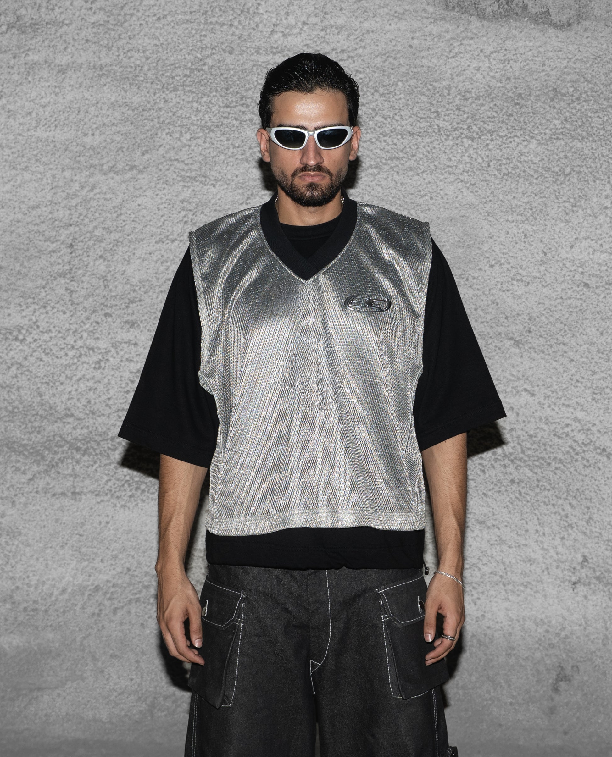 Constructed from a double-knitted polyester blend with 100% cotton rib elastic, this piece delivers structure with comfort. Silver satin piping highlights the seams, bringing a clean, sporty edge to the design. Lightweight yet durable, the overlay is built to layer effortlessly and elevate any look.