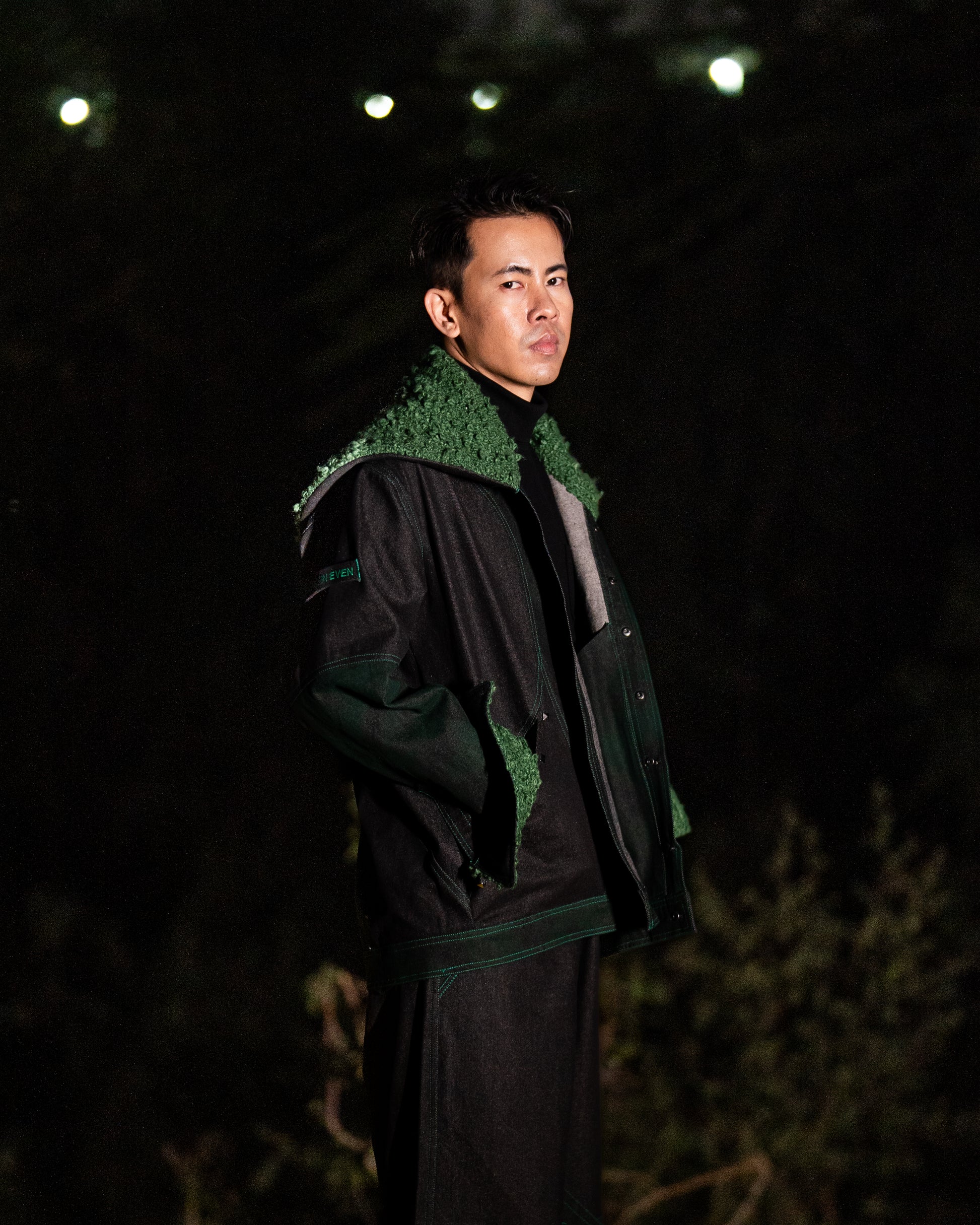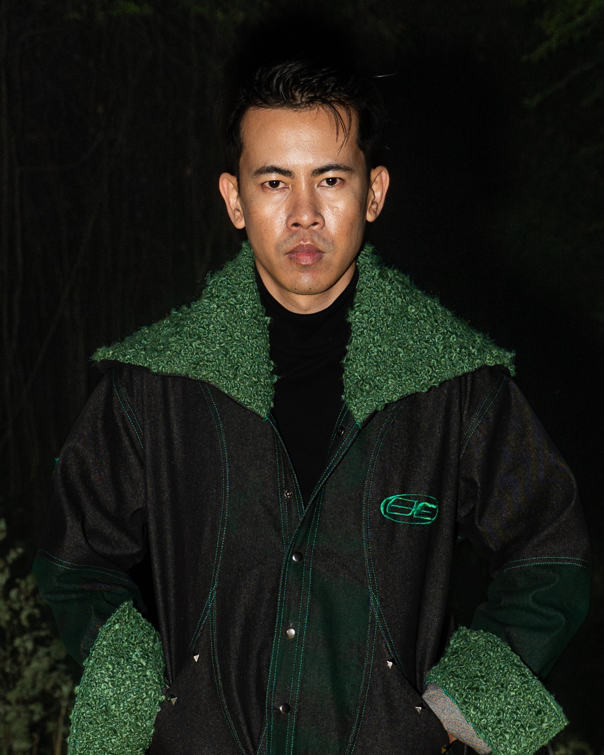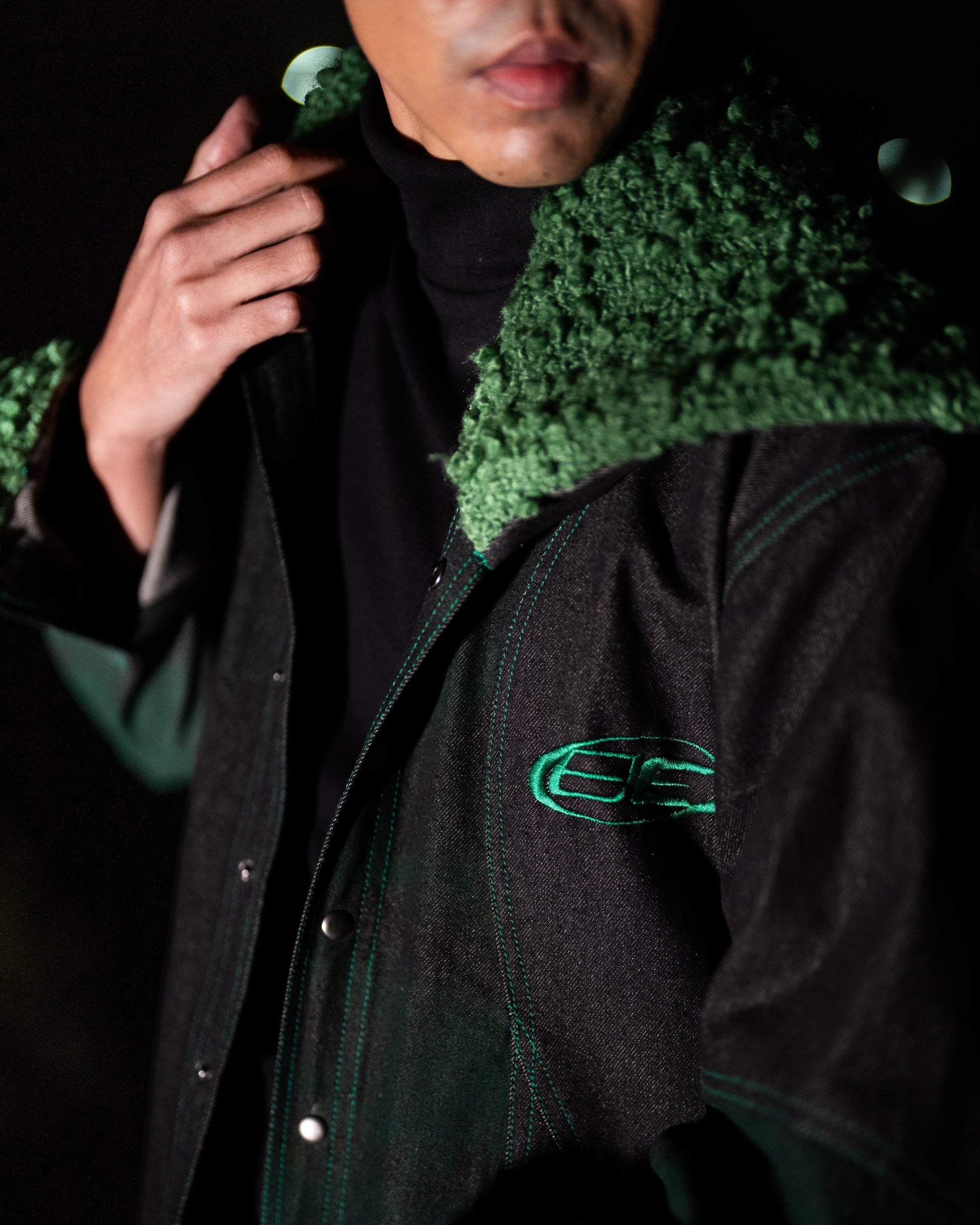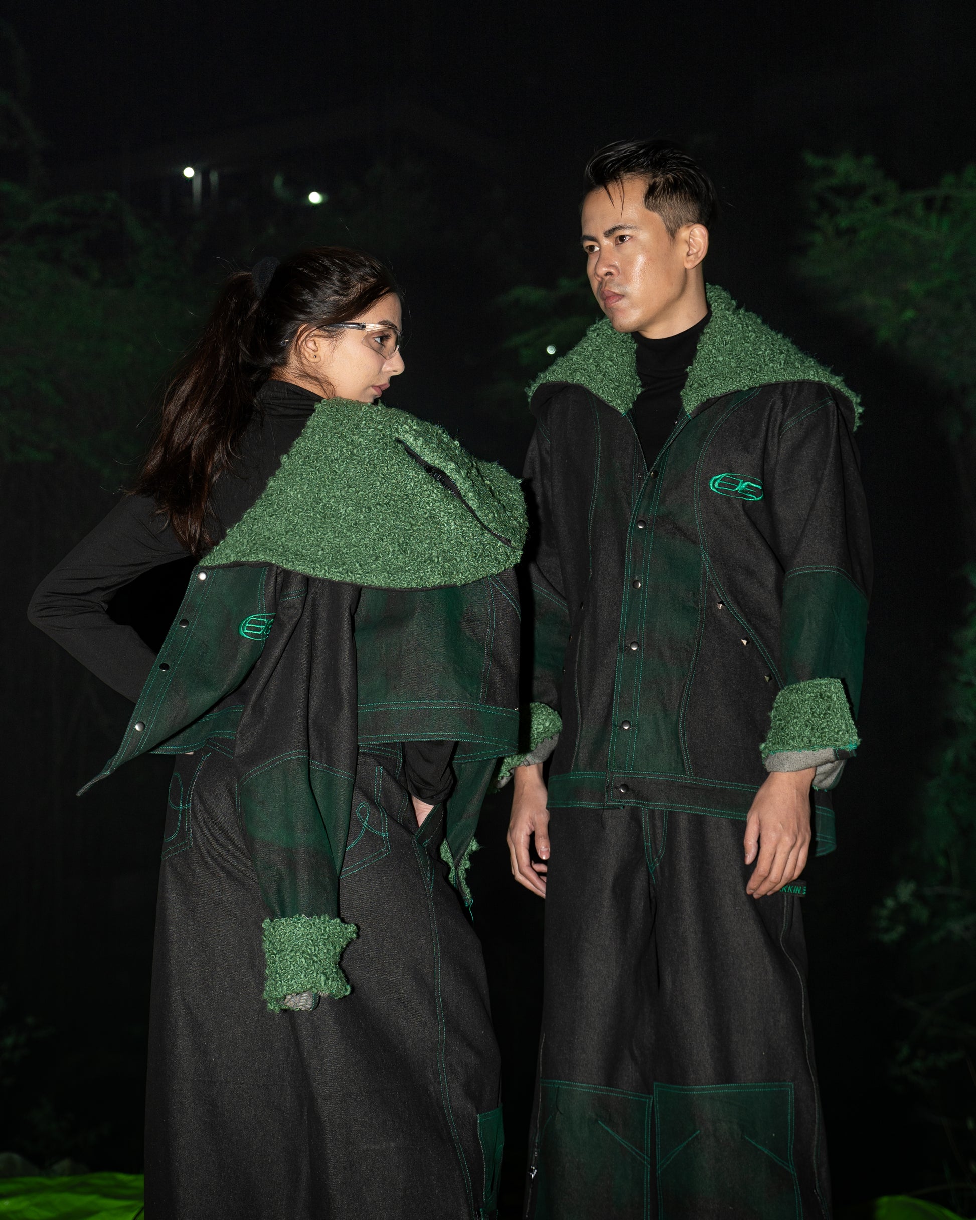 100% Raw Denim, 100% In-House Treated Raw Denim (Green), 100% Wool Bouclé Fabric, Metal Embellishments