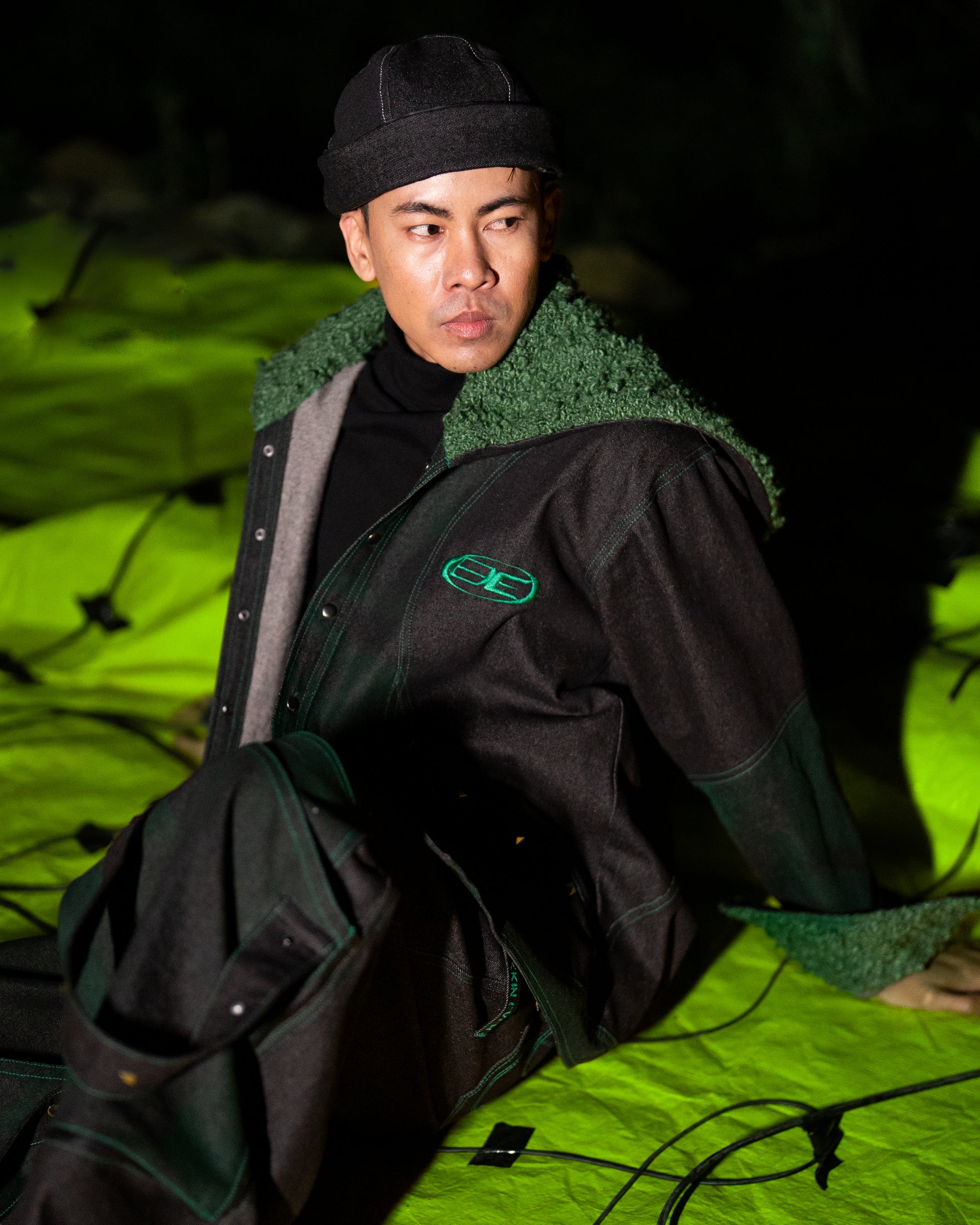 The Green Denim Jeans are made from in-house treated raw denim in a deep green shade. These baggy-fit jeans feature multiple spacious pockets, including double cross-pockets, large knee pockets, and a detachable panel that converts into a tote bag using a chunky black zipper closure. Metal studs and the signature dark techno green logo add detailing. Designed for comfort and function, the relaxed silhouette allows freedom of movement while offering modular utility.