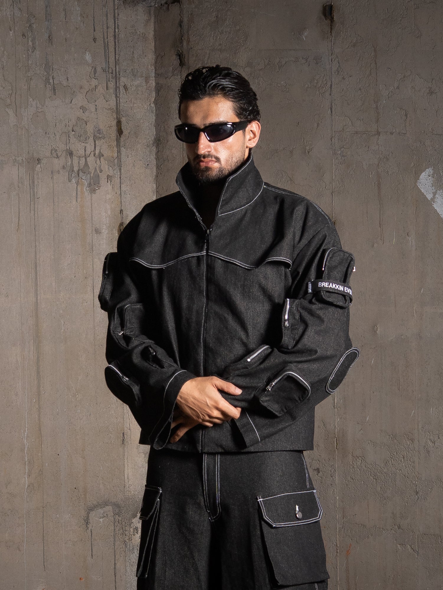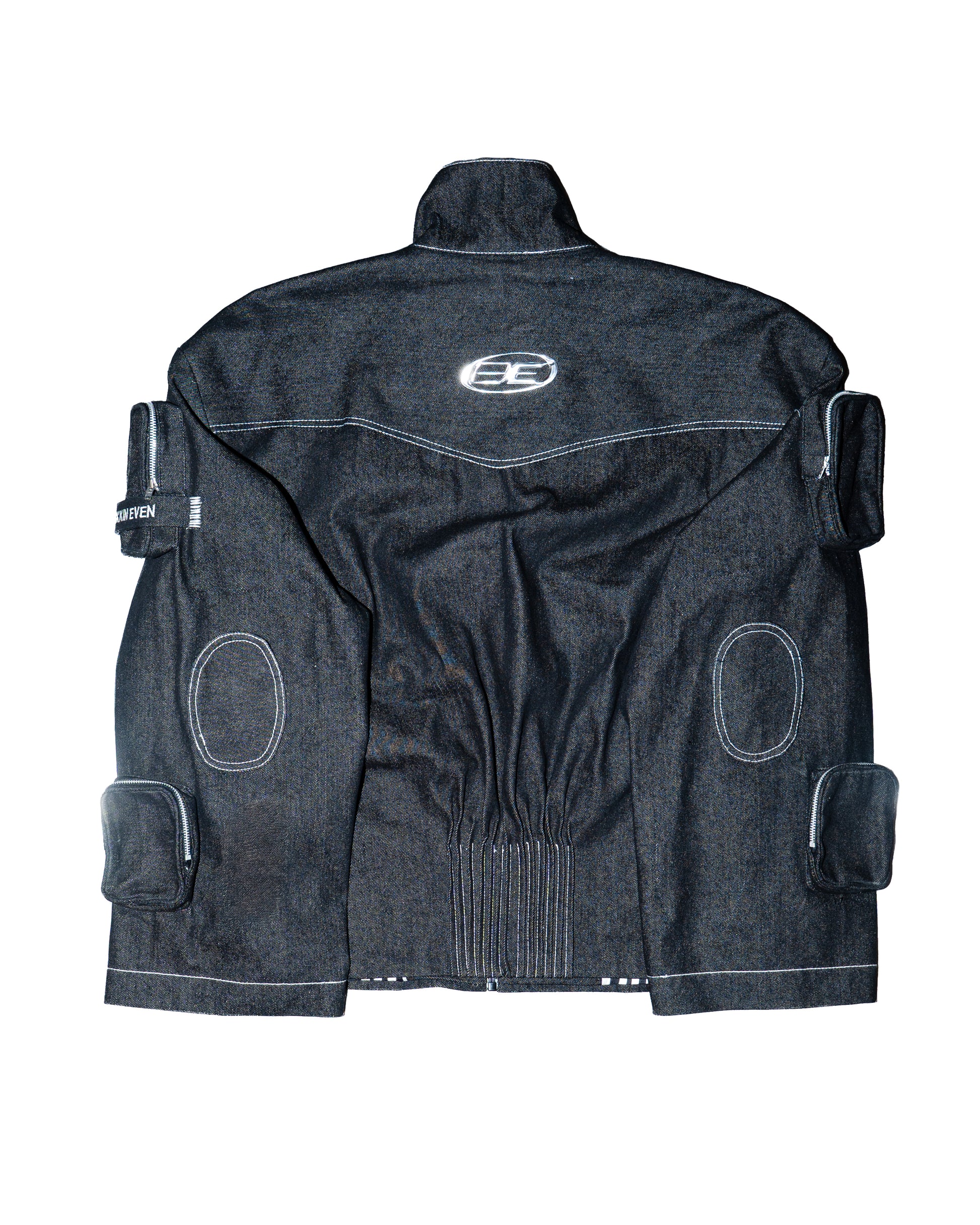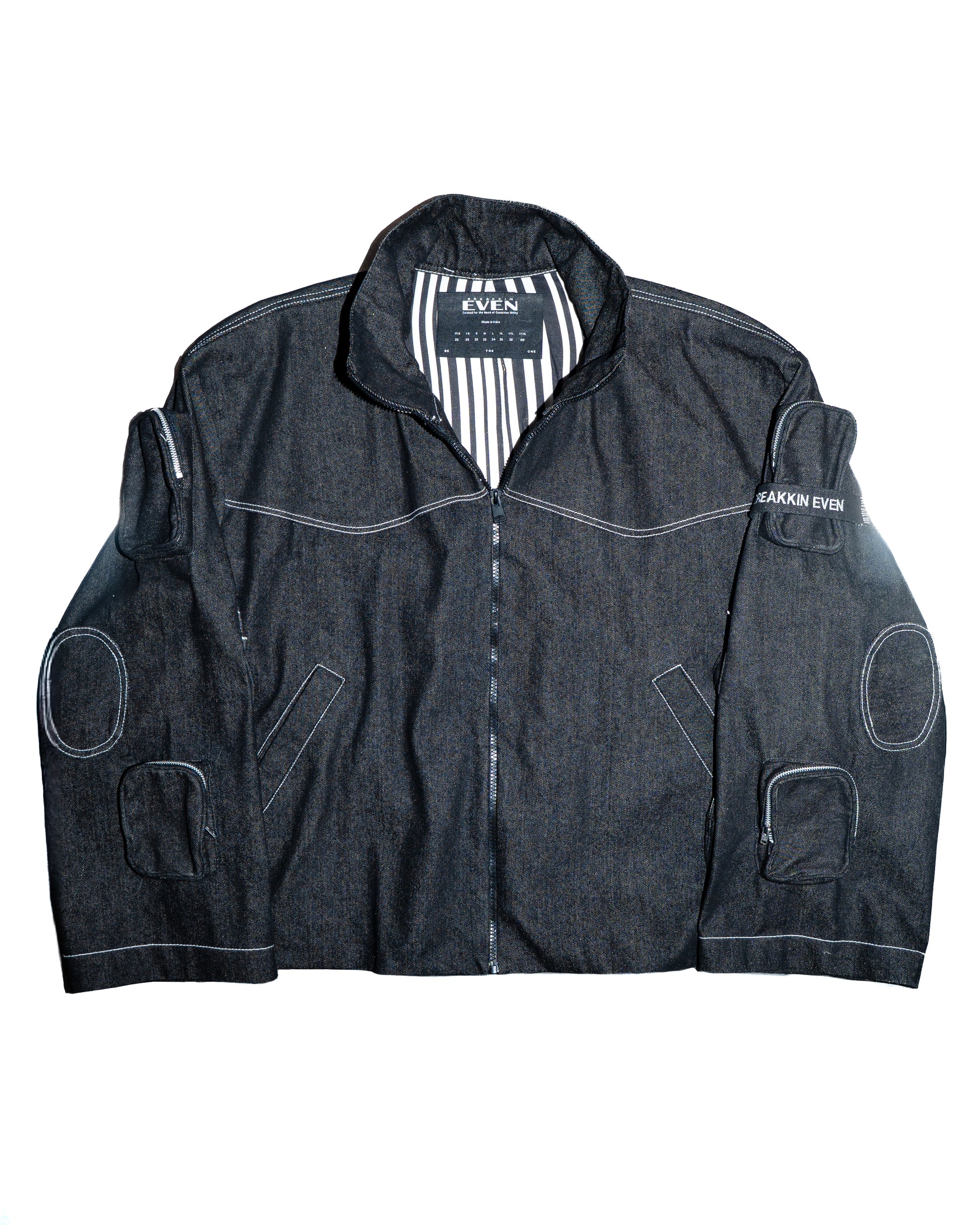 Crafted from 100% raw denim, this jacket blends bold design with utilitarian function. It features 12 pockets, including 5 utility pockets on each sleeve, 2 large front pockets, a metallic silver front zipper, and a metallic BE logo at the back. Lined with printed natural banana fabric that feels soft against the skin, it balances structure with comfort and detail-driven craftsmanship.