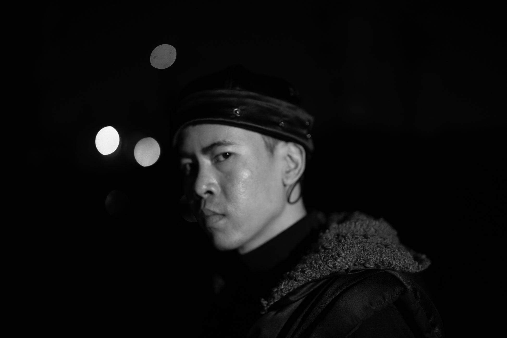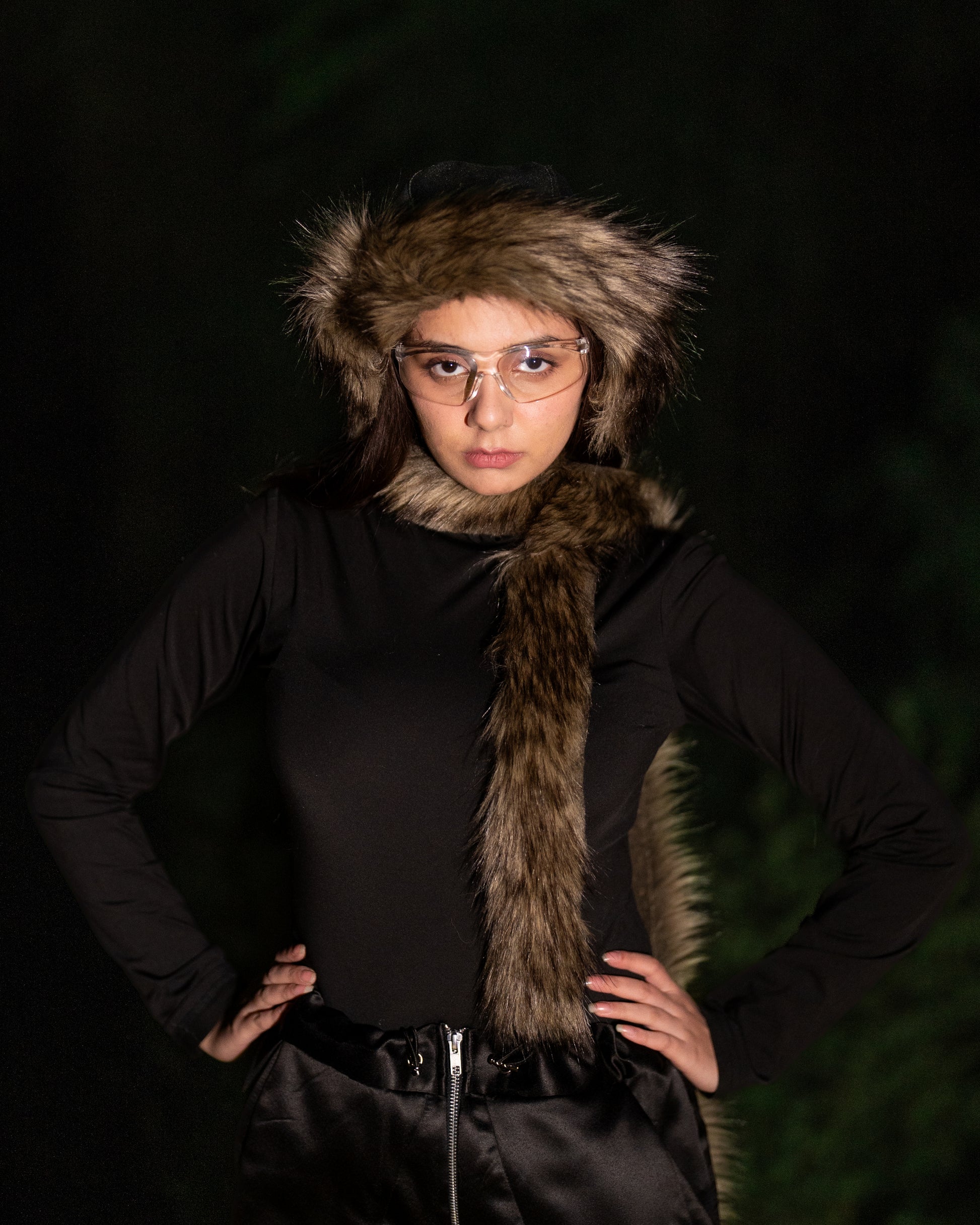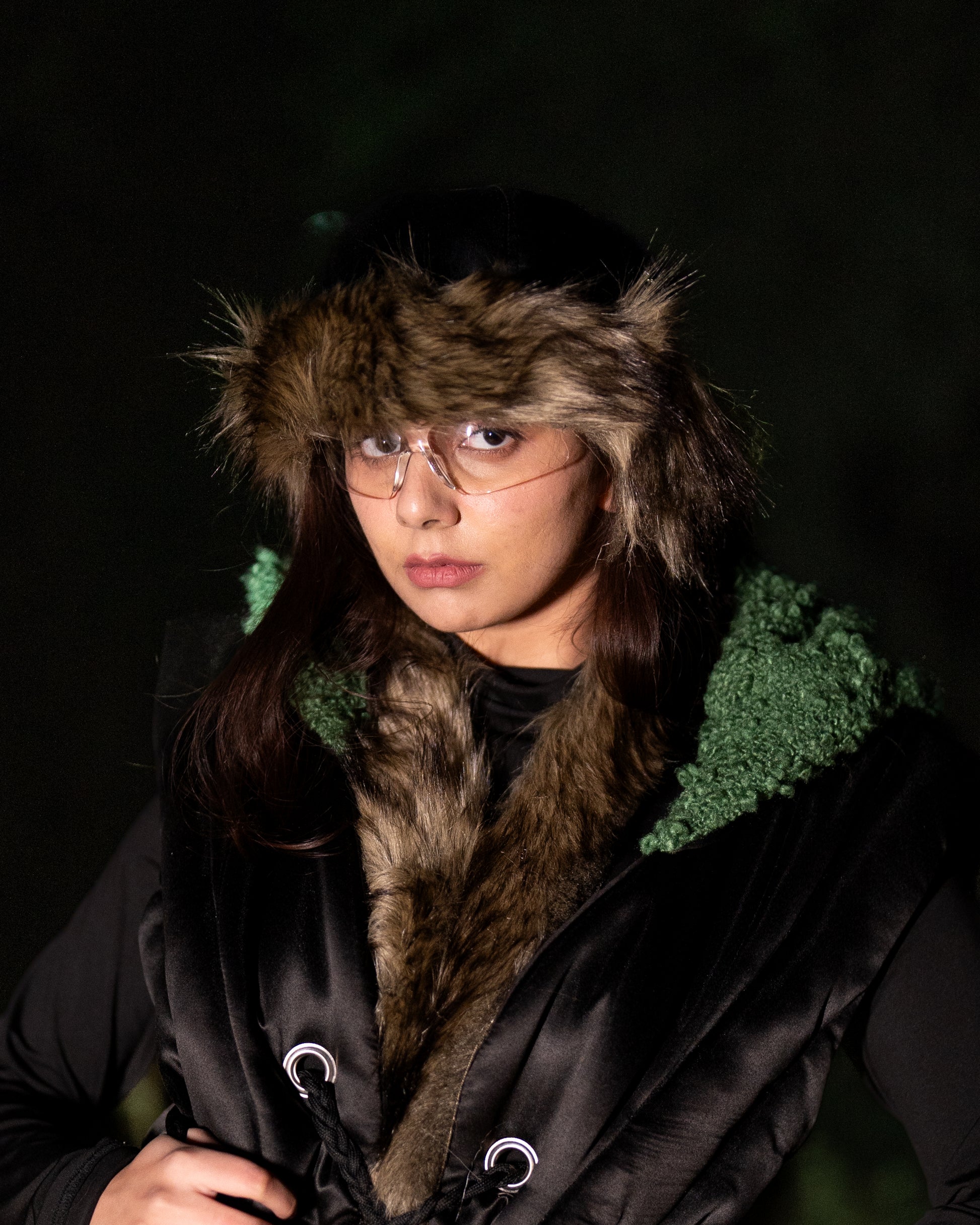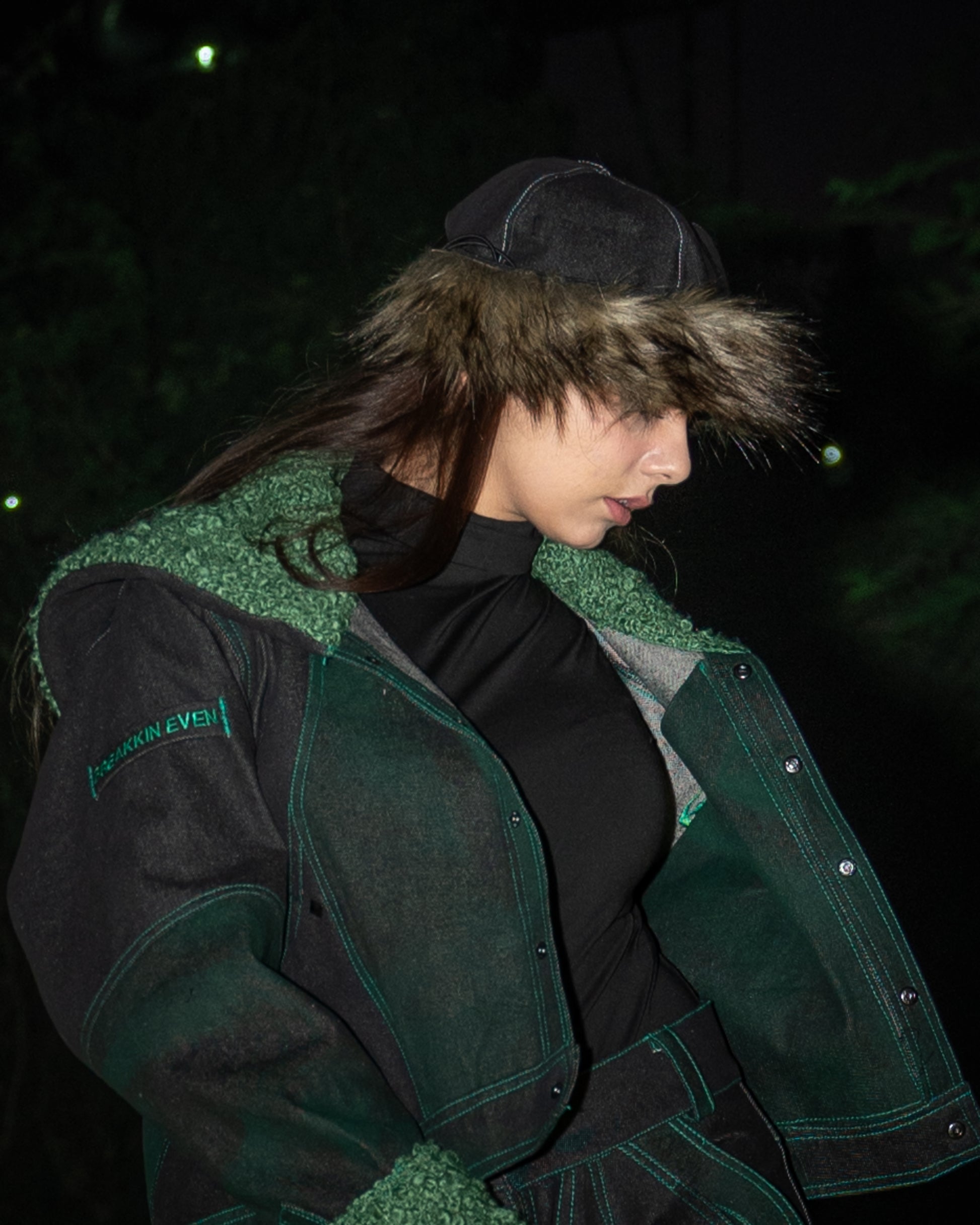 This reversible hat features raw denim on one side and recycled satin on the other, offering two unique looks. Snap-on fur attachments—a sleek front strip and cozy ear muffs—add warmth and style versatility. Finished with metal snap buttons and an adjustable elastic loop with metal adjuster, it’s designed for comfort, function, and seasonal adaptability.