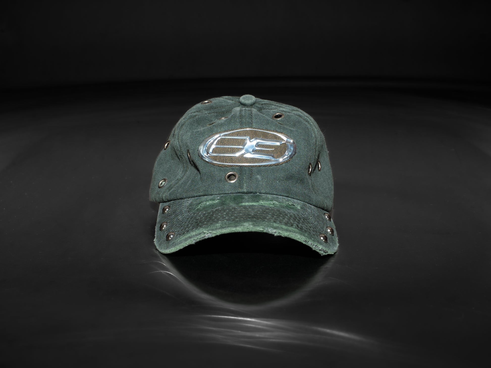 Greyish green denim with metallic rivets all over, metallic studs on the brim, BE metallic logo on the front, upcycled reconstructed leather patch on the back, and adjustable strap.