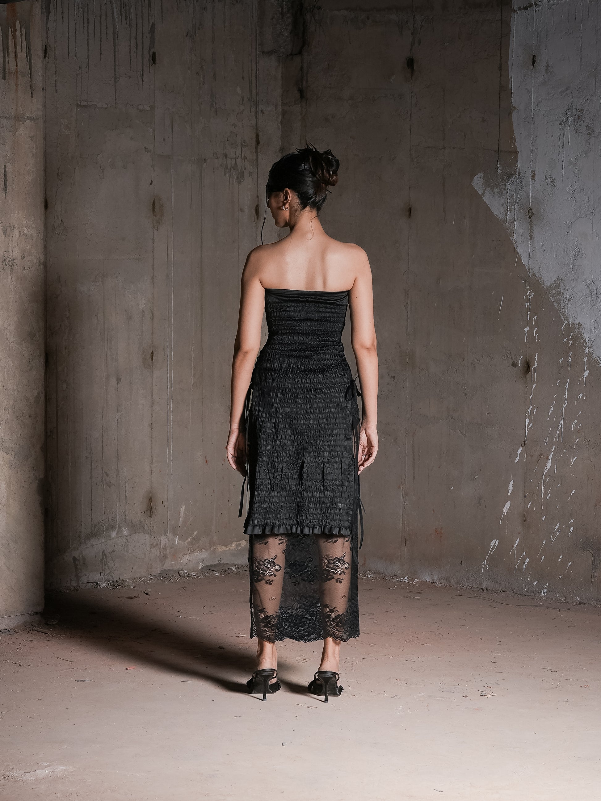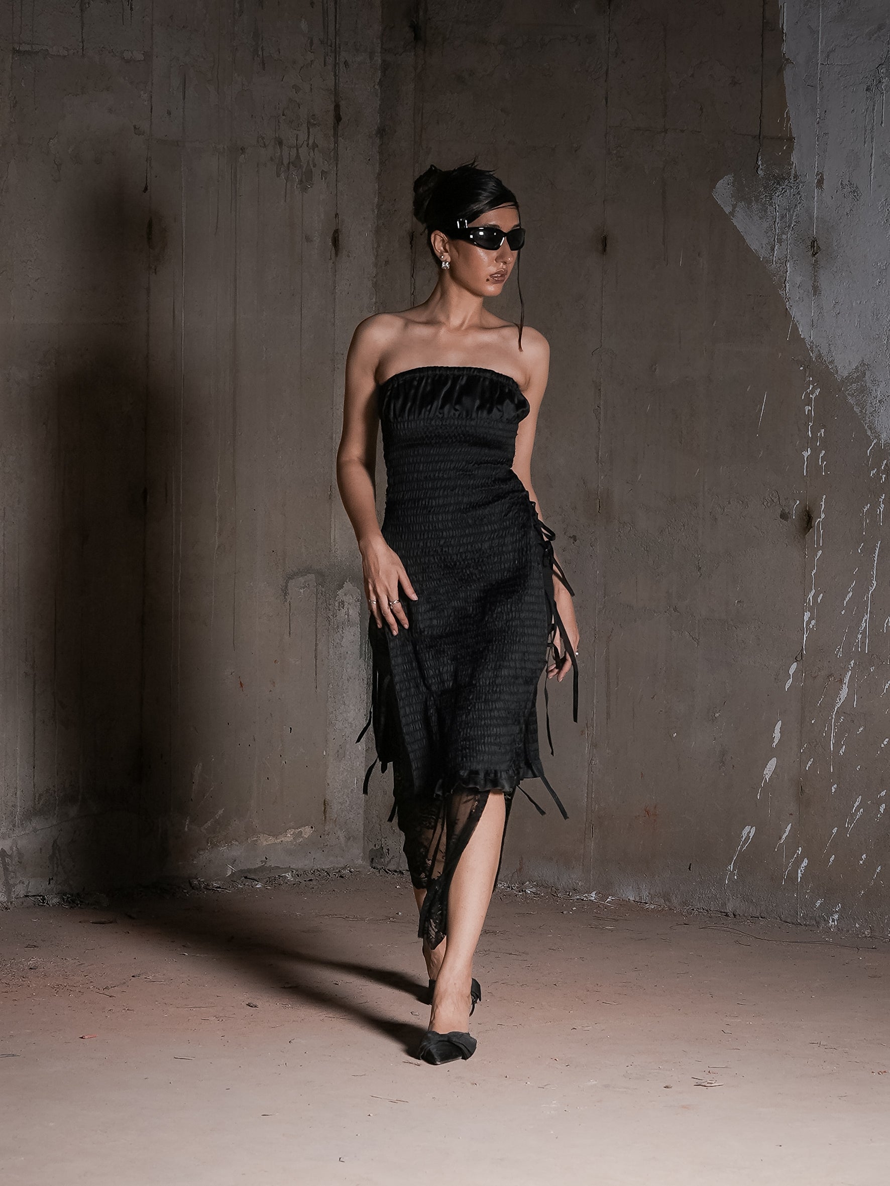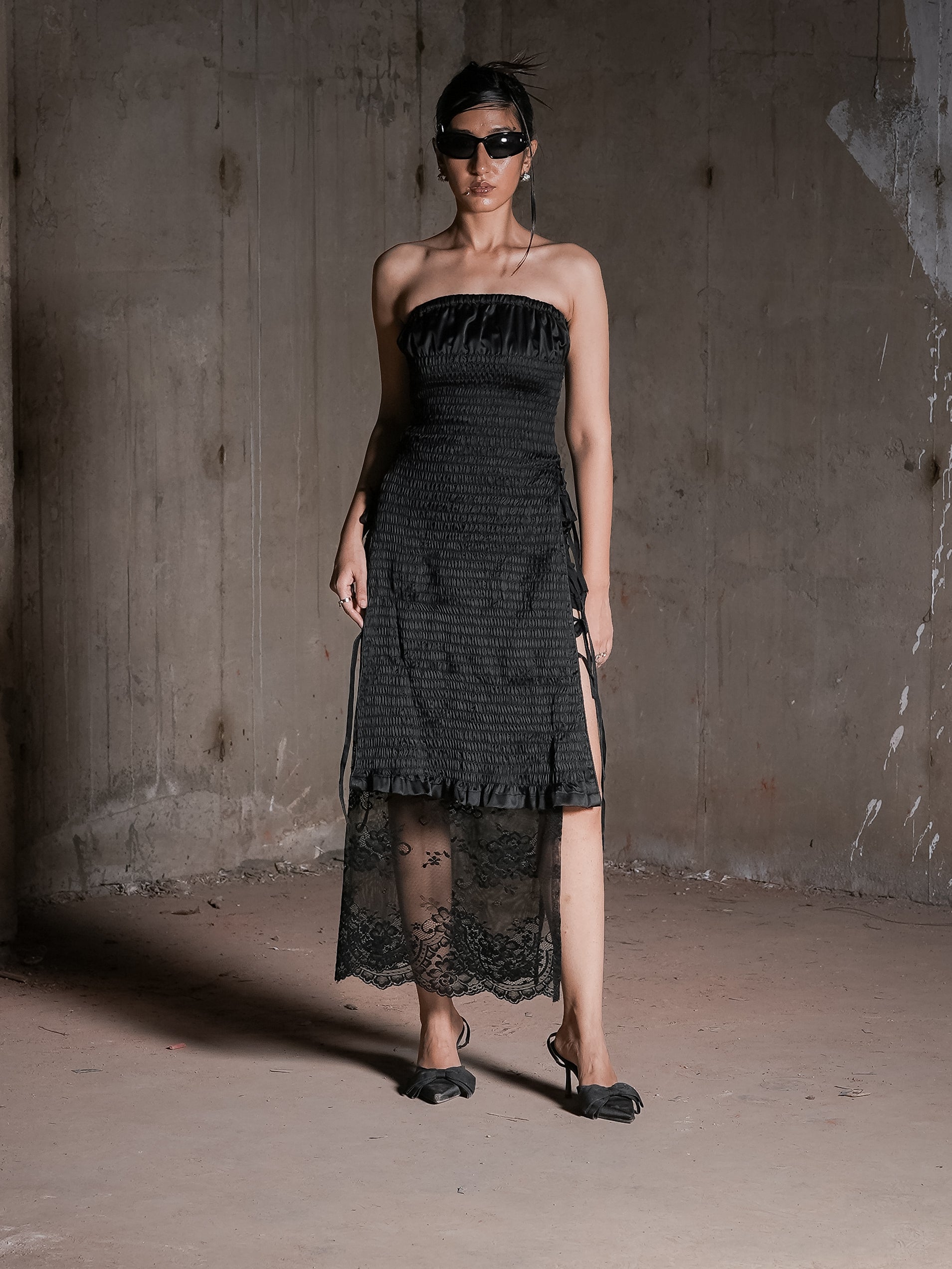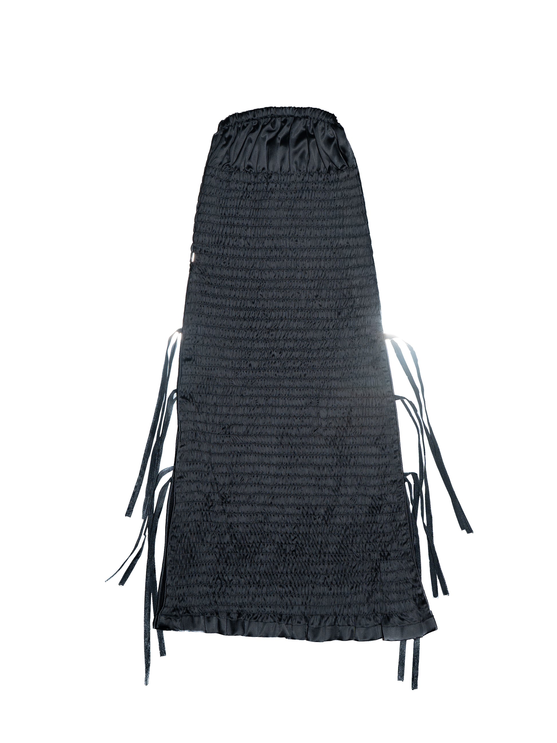 Made from recycled satin, this tunic features gathered detailing at the top and smocking all over, allowing it to stretch and contour to the body. High side slits are finished with piping, and adjustable strings let you shape the hips and legs or leave them open for a relaxed look.