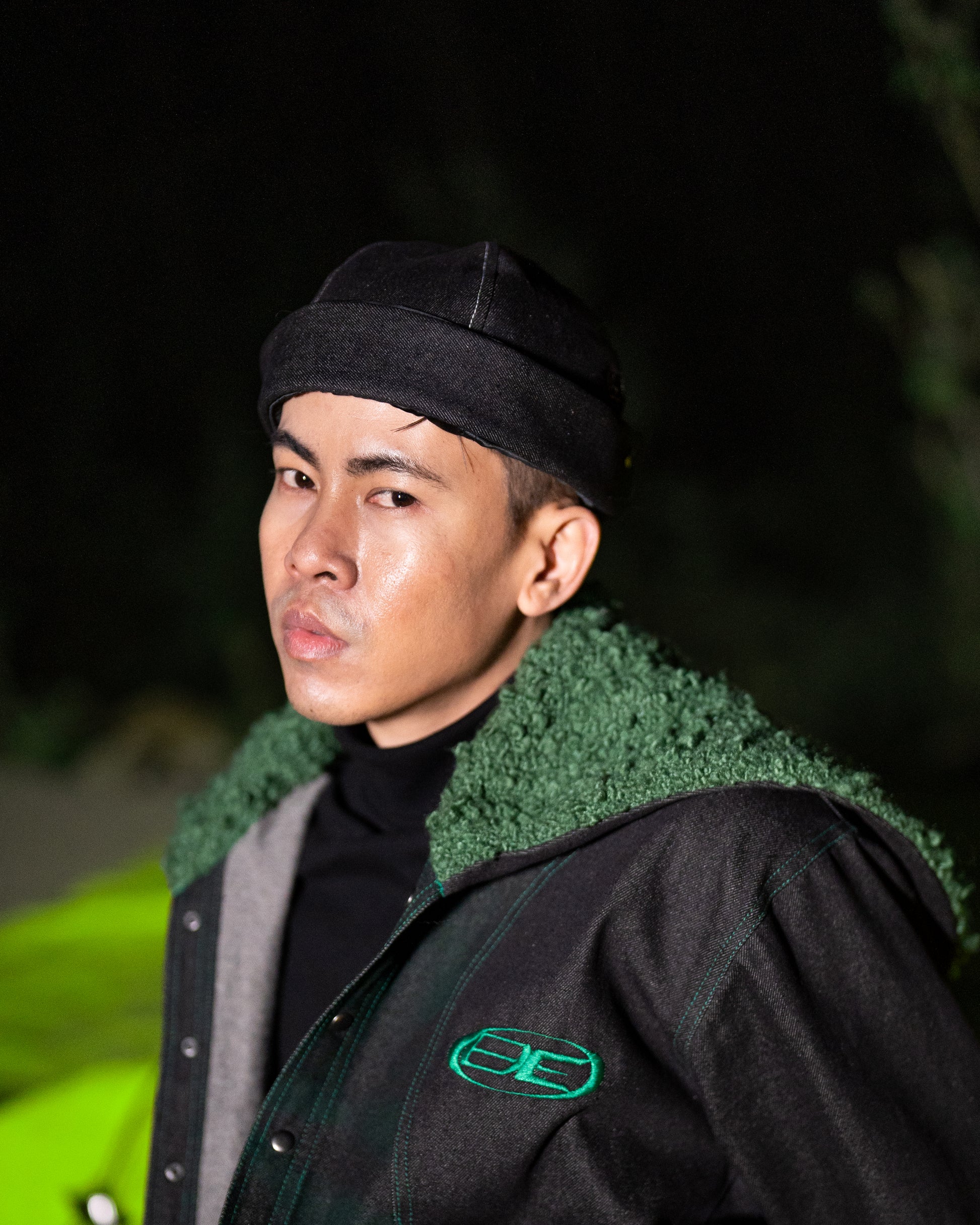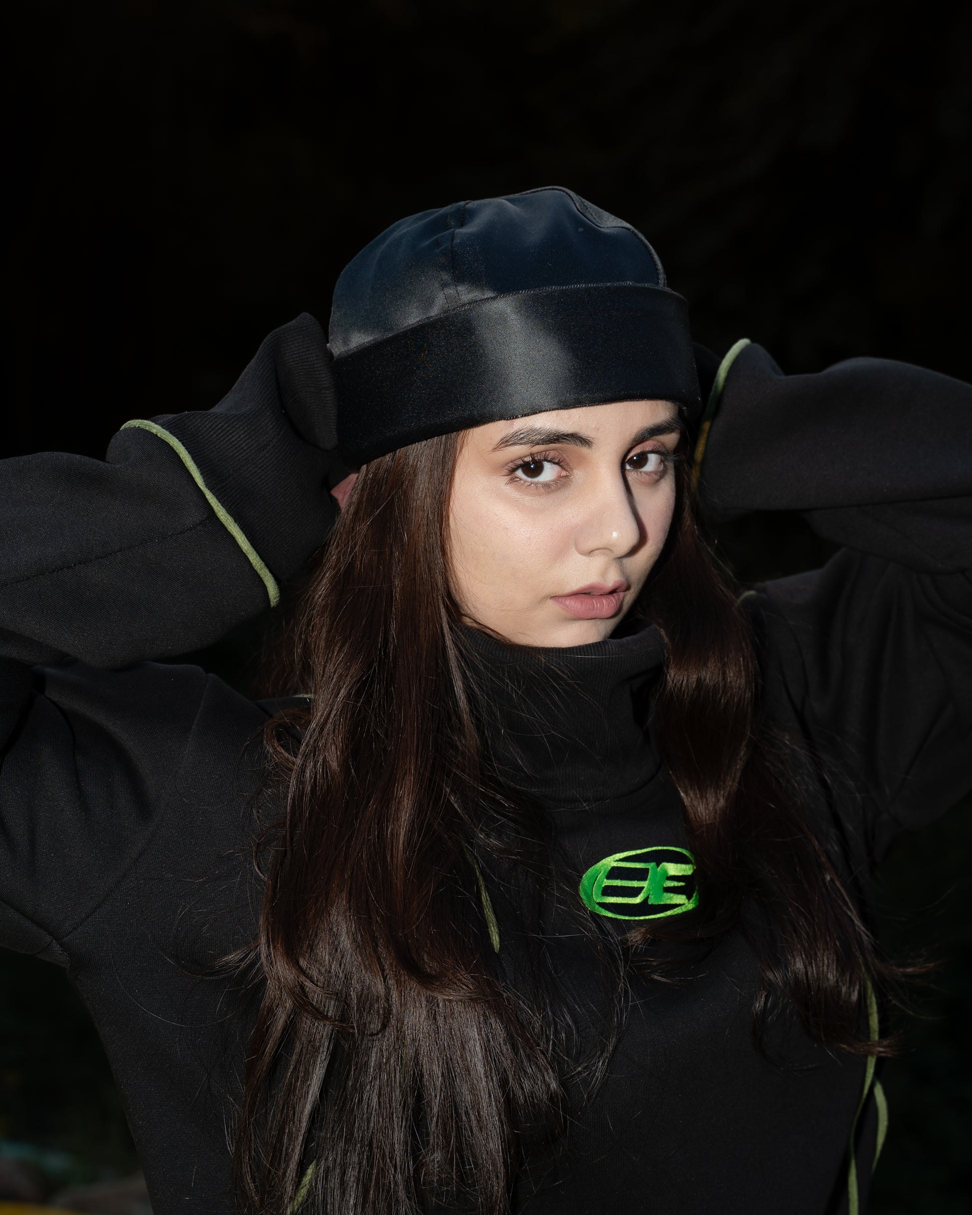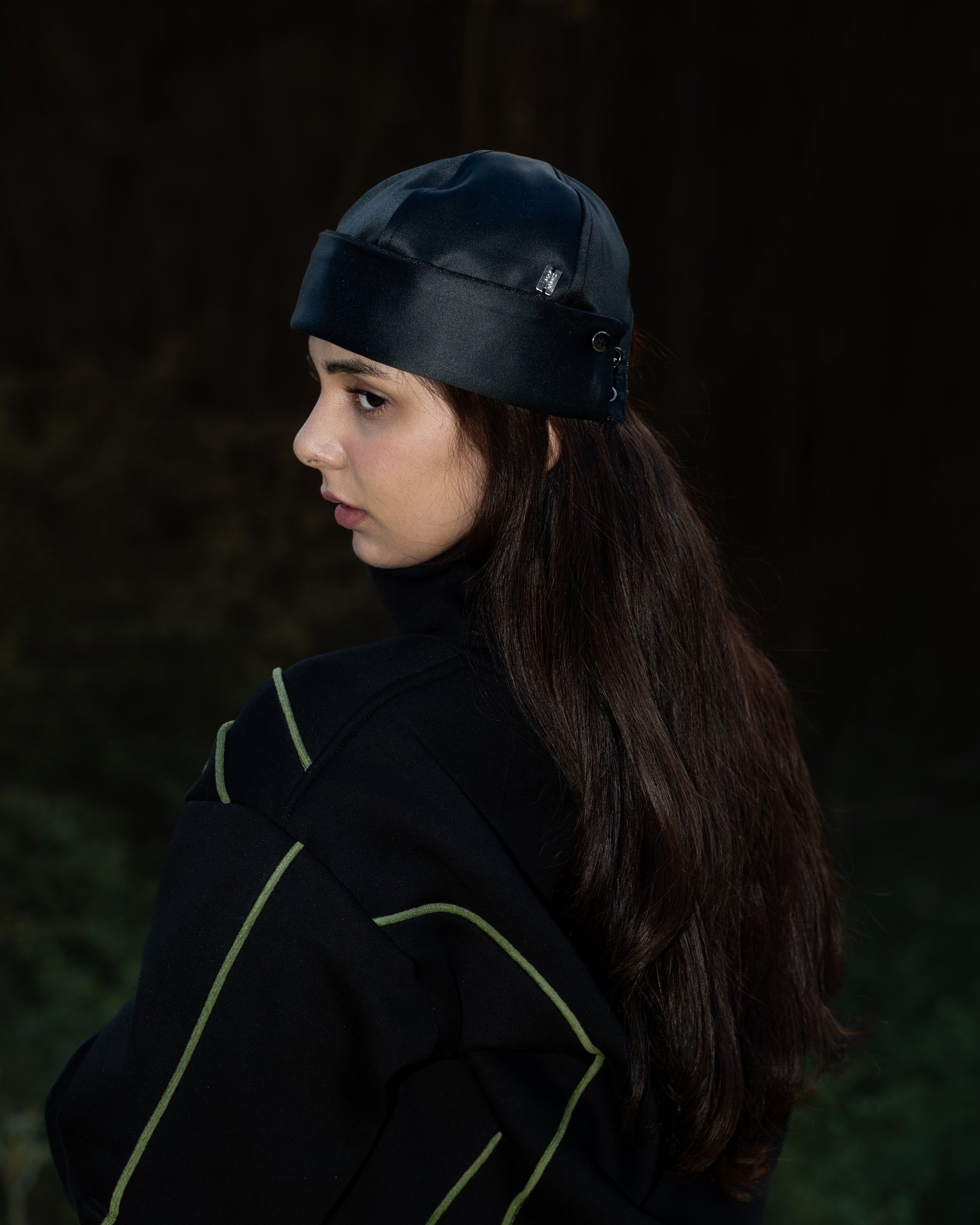 The Reversible Docker Hat is made from raw denim and recycled satin, offering two distinct looks in one accessory. Designed with an adjustable elastic loop and metal adjuster at the back, it ensures a secure and comfortable fit.