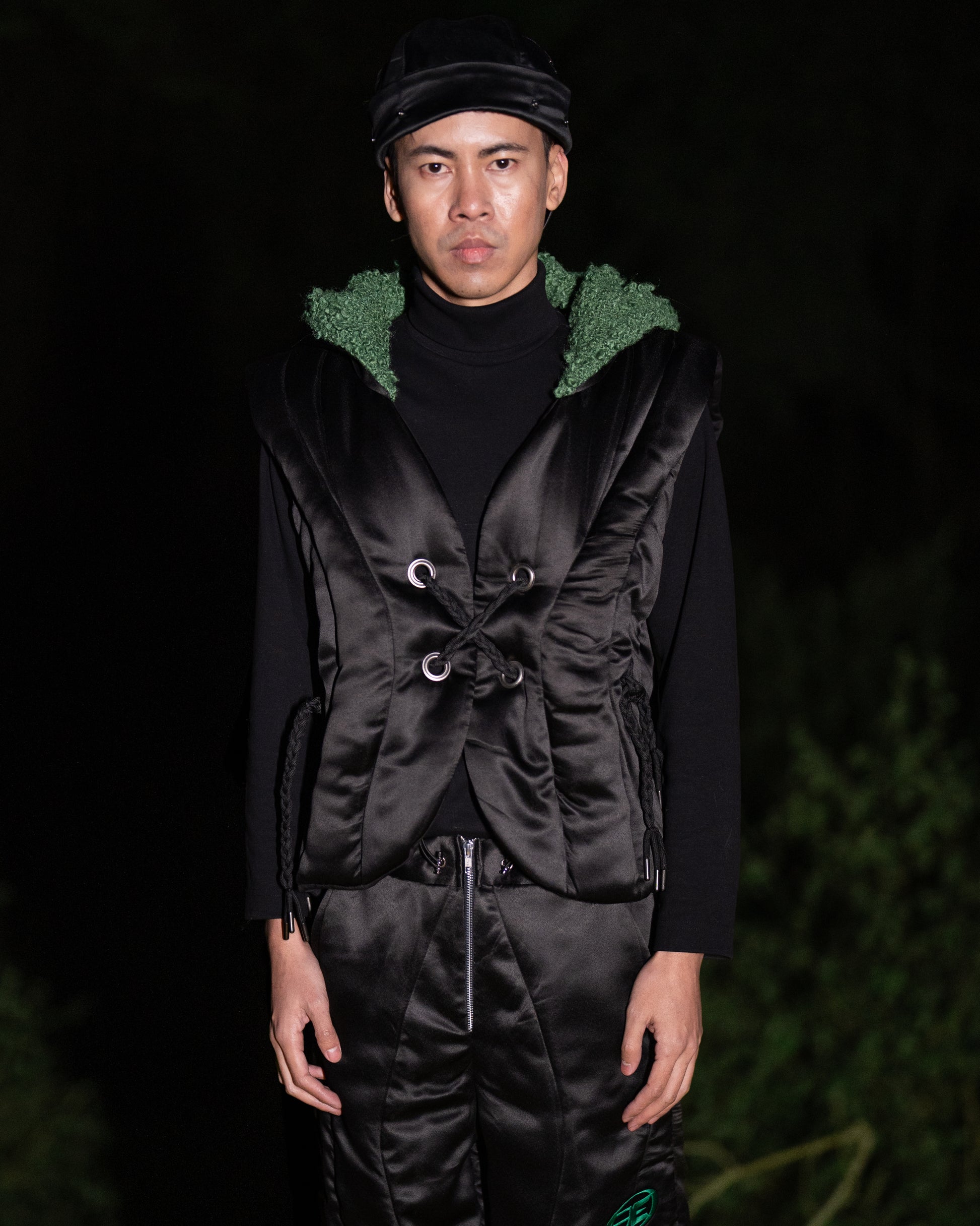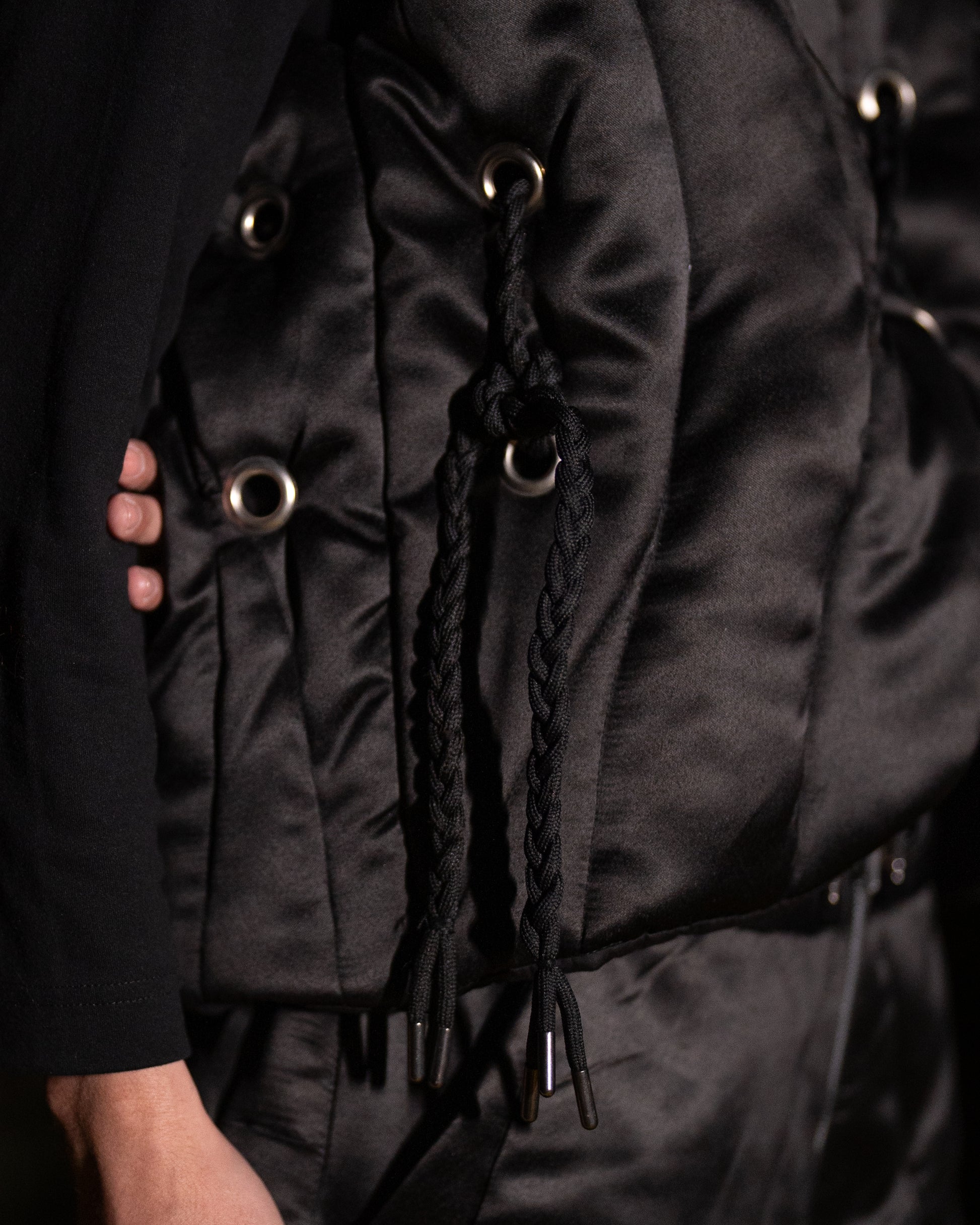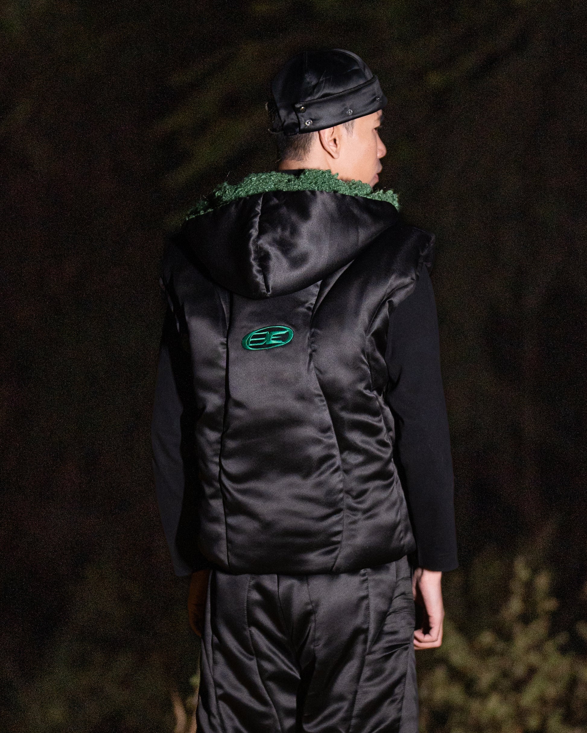 The Volt Puffer Jacket is crafted from recycled satin with a sleek black finish and curved quilted lines inspired by wire formations. It features a green bouclé hood, metallic rivet detailing, and a braided drawstring closure at the front. Designed for warmth and functionality, the jacket offers a structured silhouette with a distinct, modern edge.