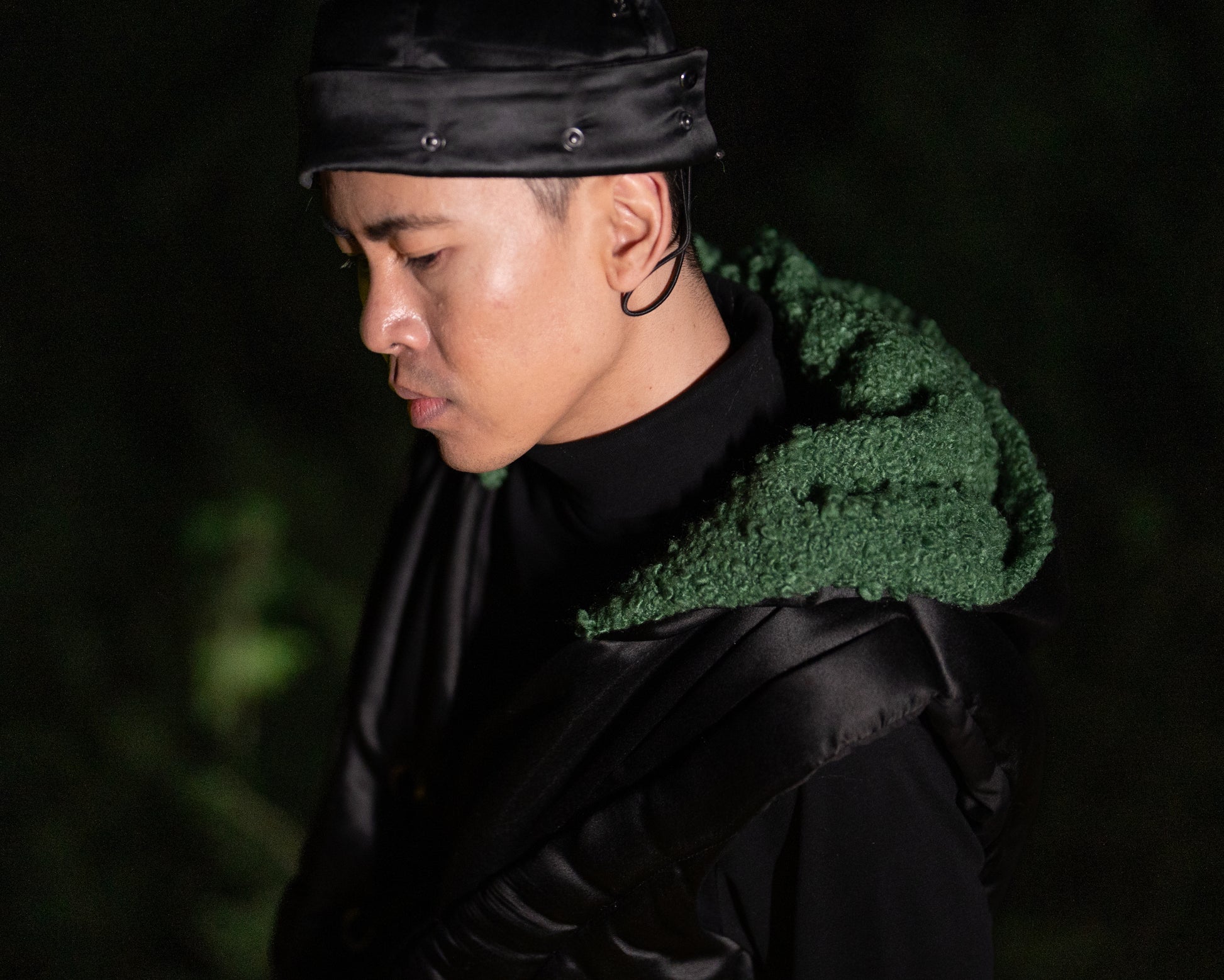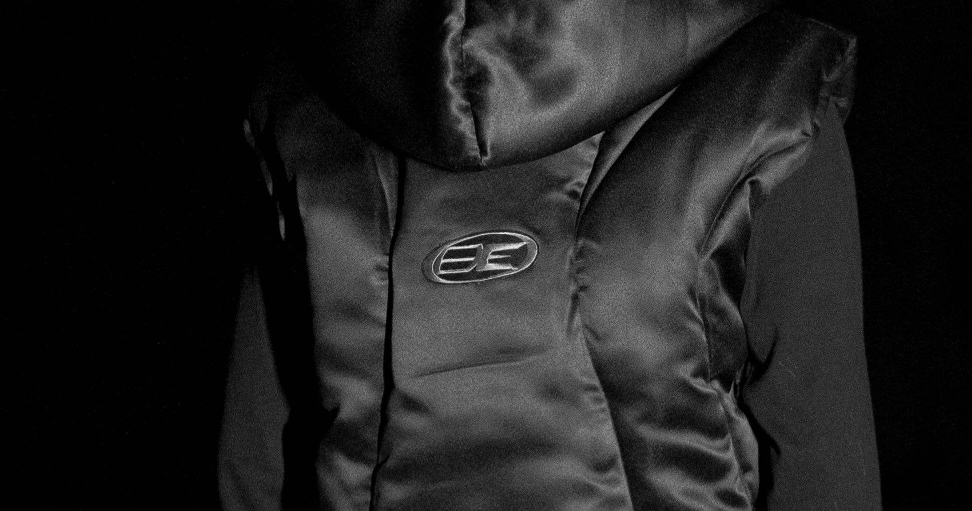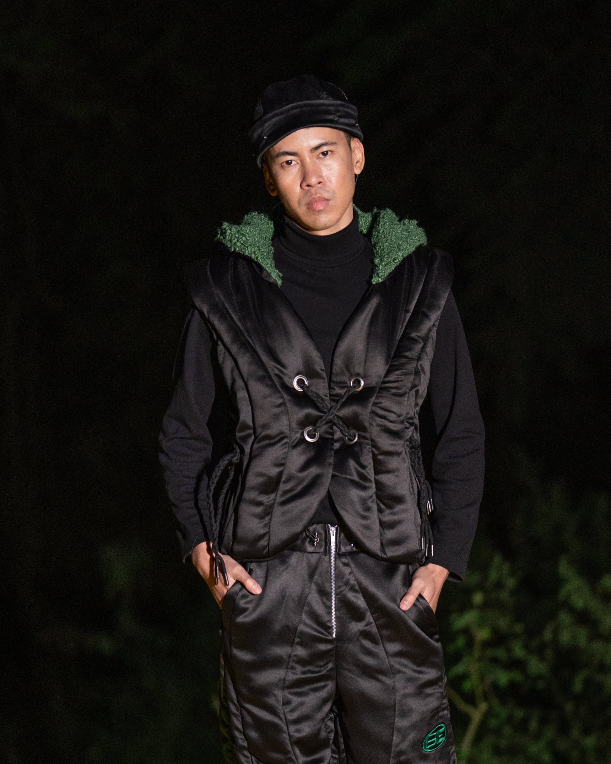 The Volt Puffer Jacket is crafted from recycled satin with a sleek black finish and curved quilted lines inspired by wire formations. It features a green bouclé hood, metallic rivet detailing, and a braided drawstring closure at the front. Designed for warmth and functionality, the jacket offers a structured silhouette with a distinct, modern edge.