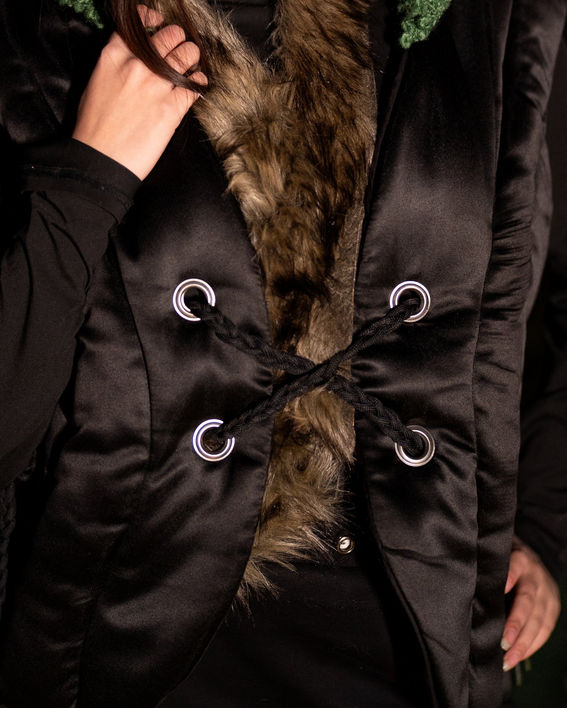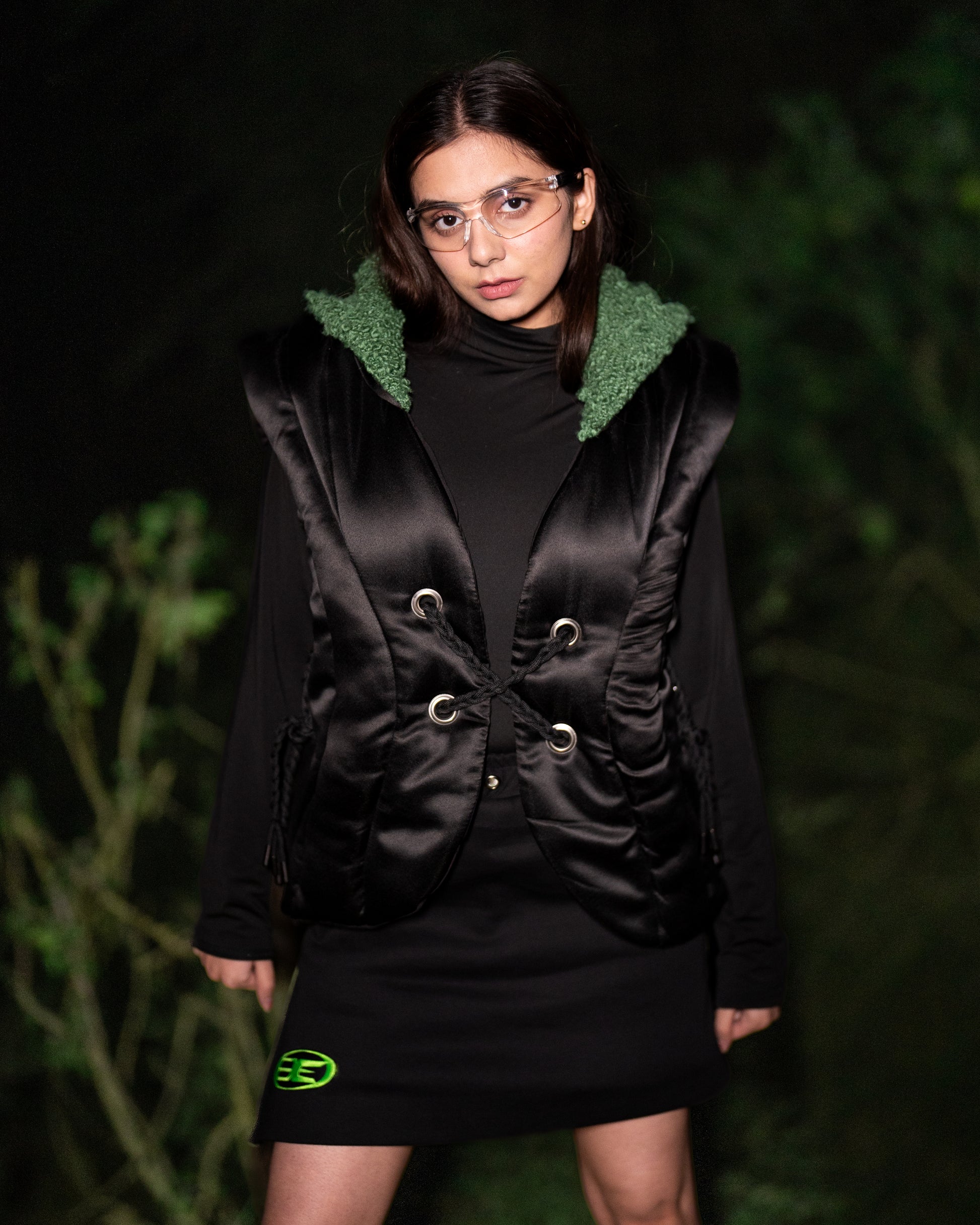The Volt Puffer Jacket is crafted from recycled satin with a sleek black finish and curved quilted lines inspired by wire formations. It features a green bouclé hood, metallic rivet detailing, and a braided drawstring closure at the front. Designed for warmth and functionality, the jacket offers a structured silhouette with a distinct, modern edge.