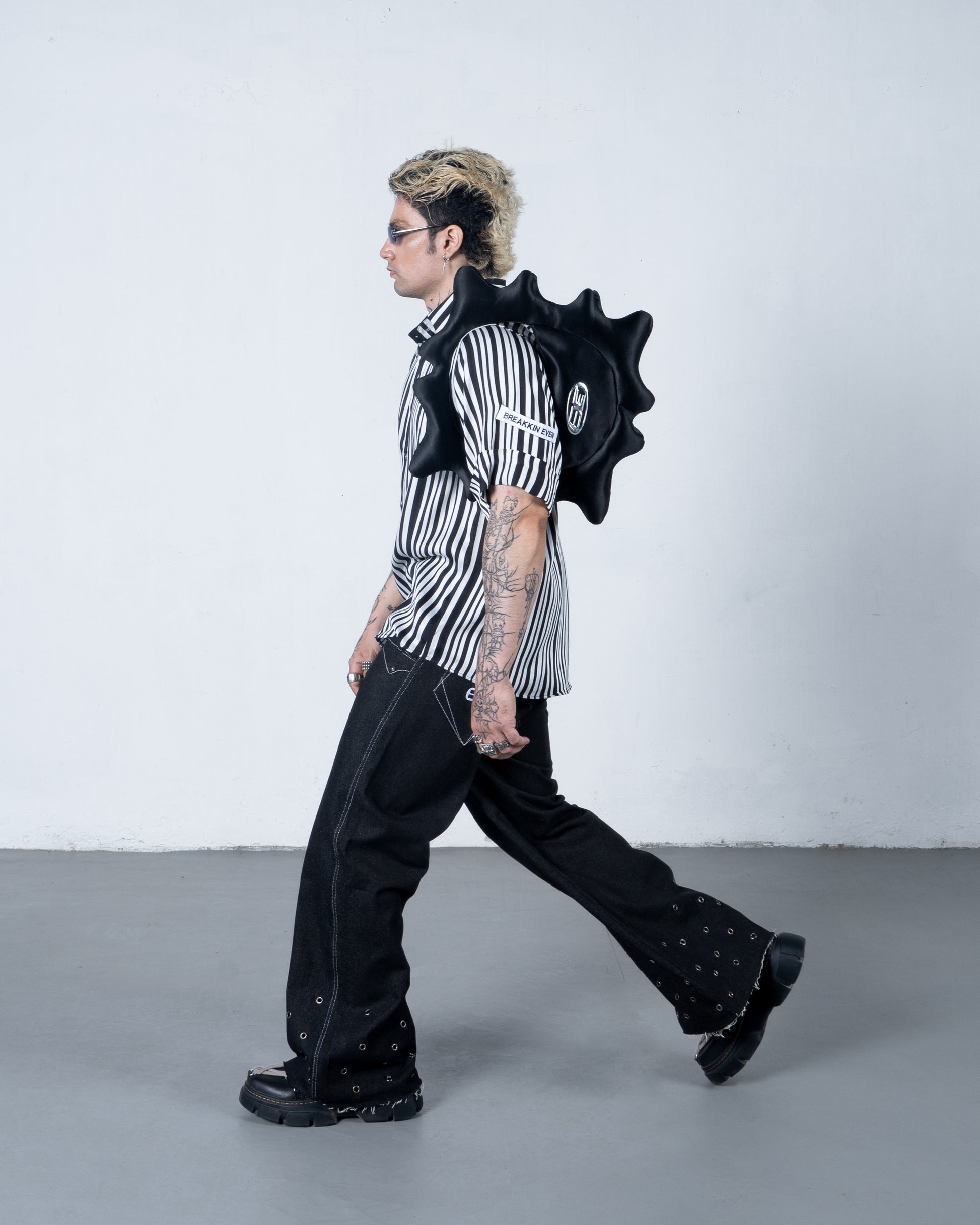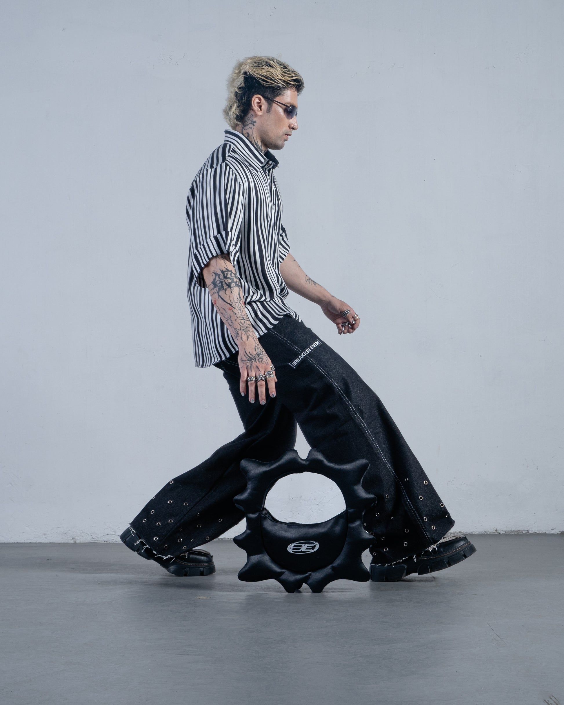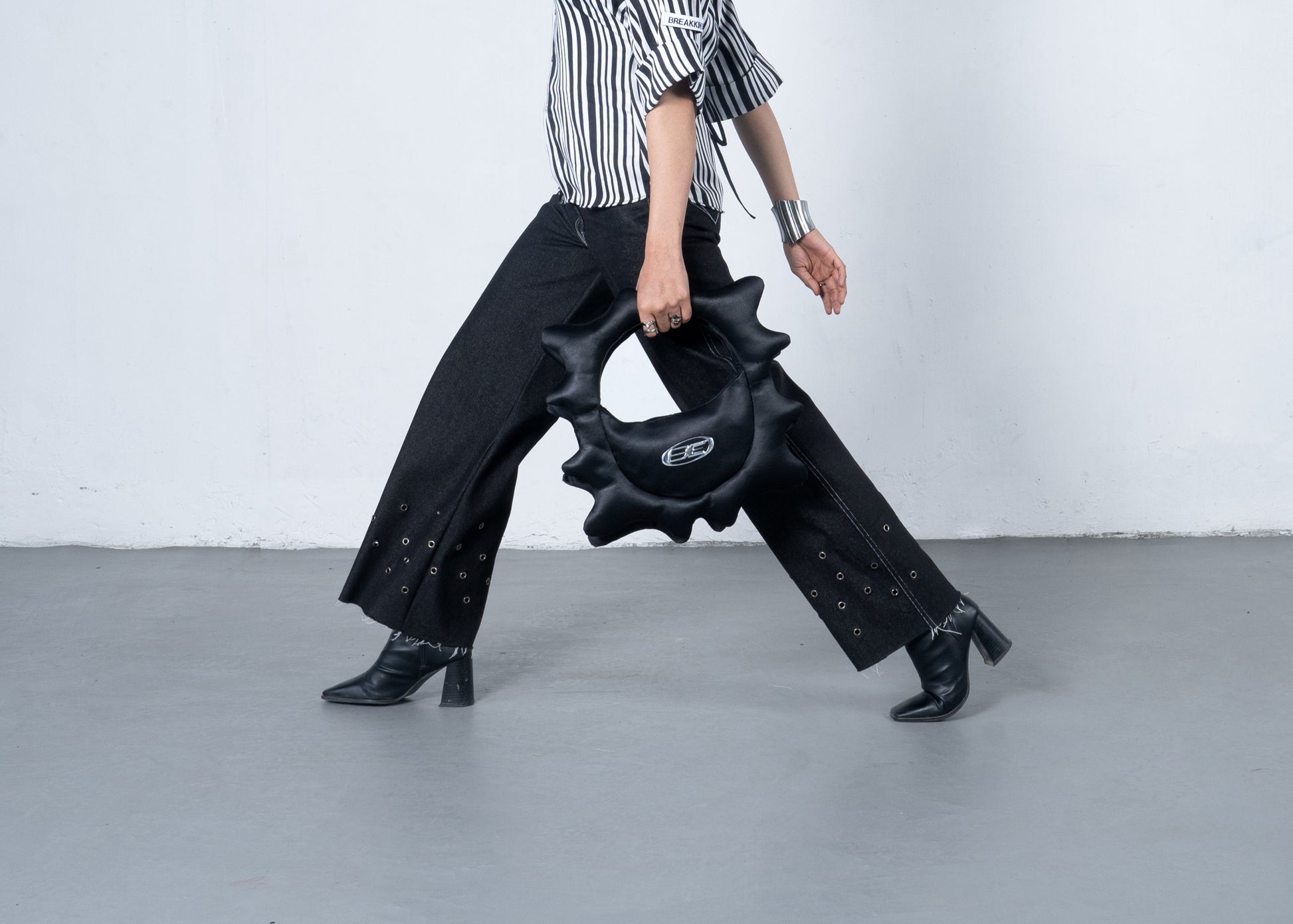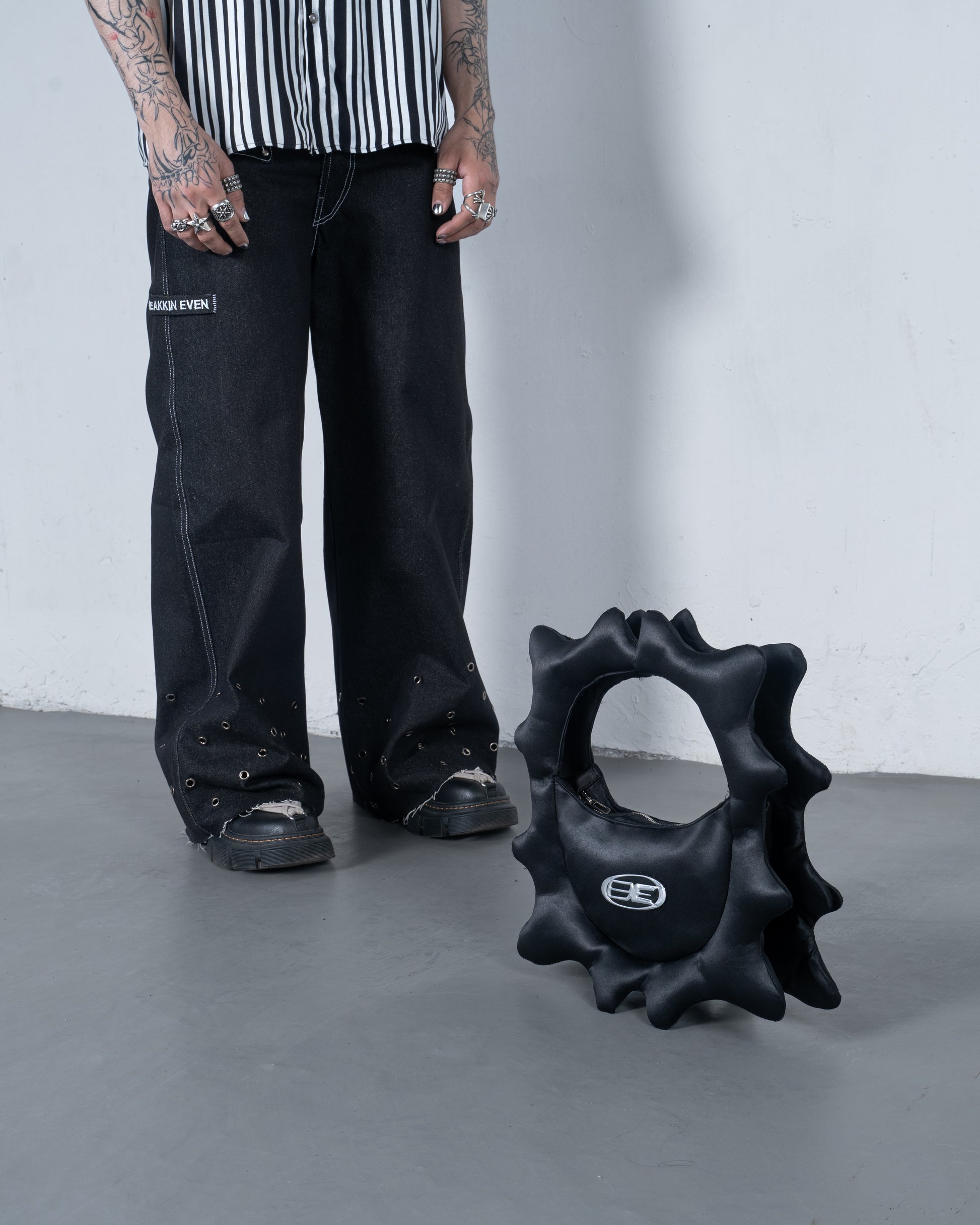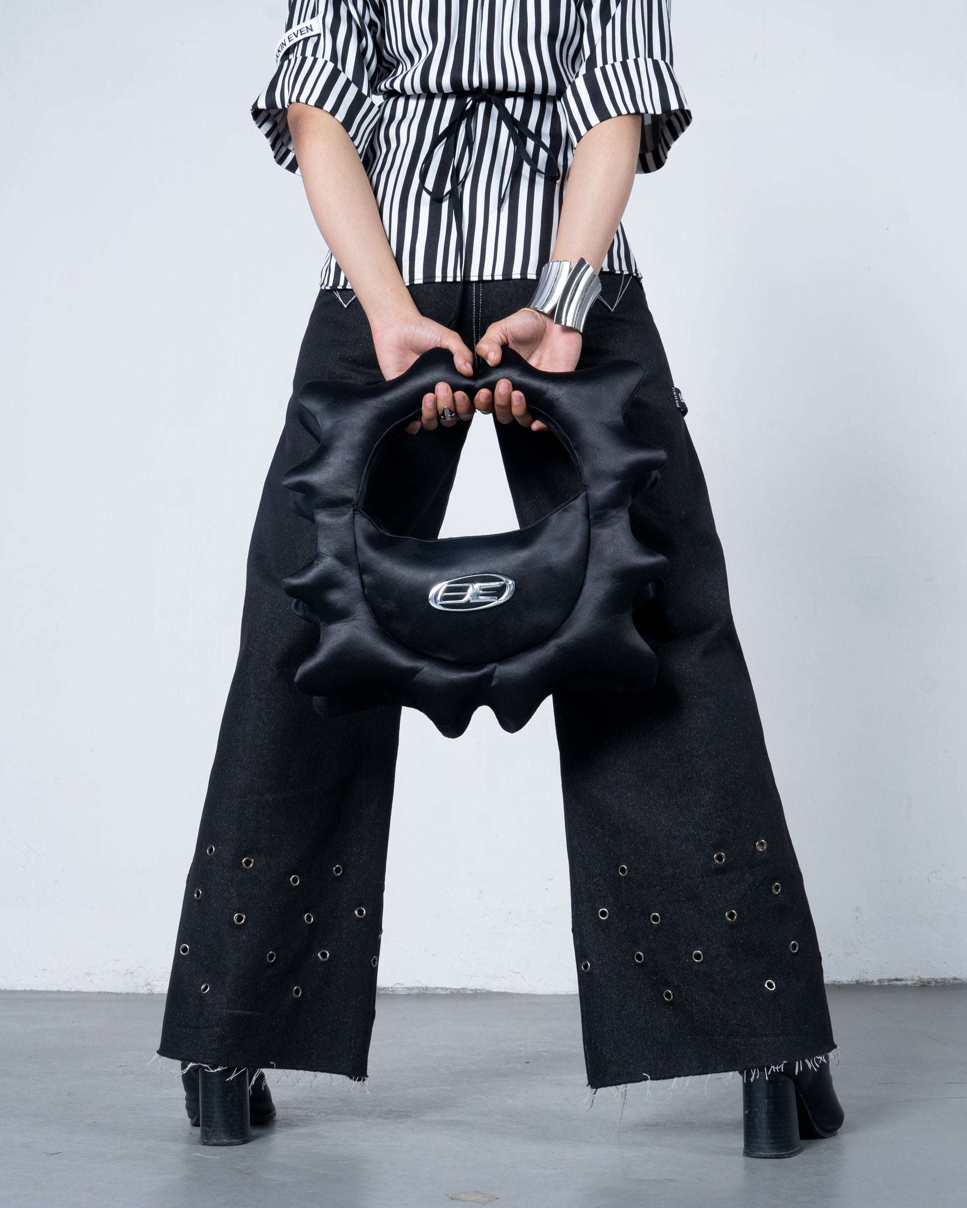 Crafted from 100% recycled satin, the Puffer Bag draws inspiration from the disruptive energy of natural waves. Its jagged, inflated silhouette and high-shine finish echo the wild, untamed motion of the sea. With a bold silver “BE” logo and circular structure, it transforms chaos into form. Lightweight, sculptural, and functional—this piece brings raw movement into wearable design.